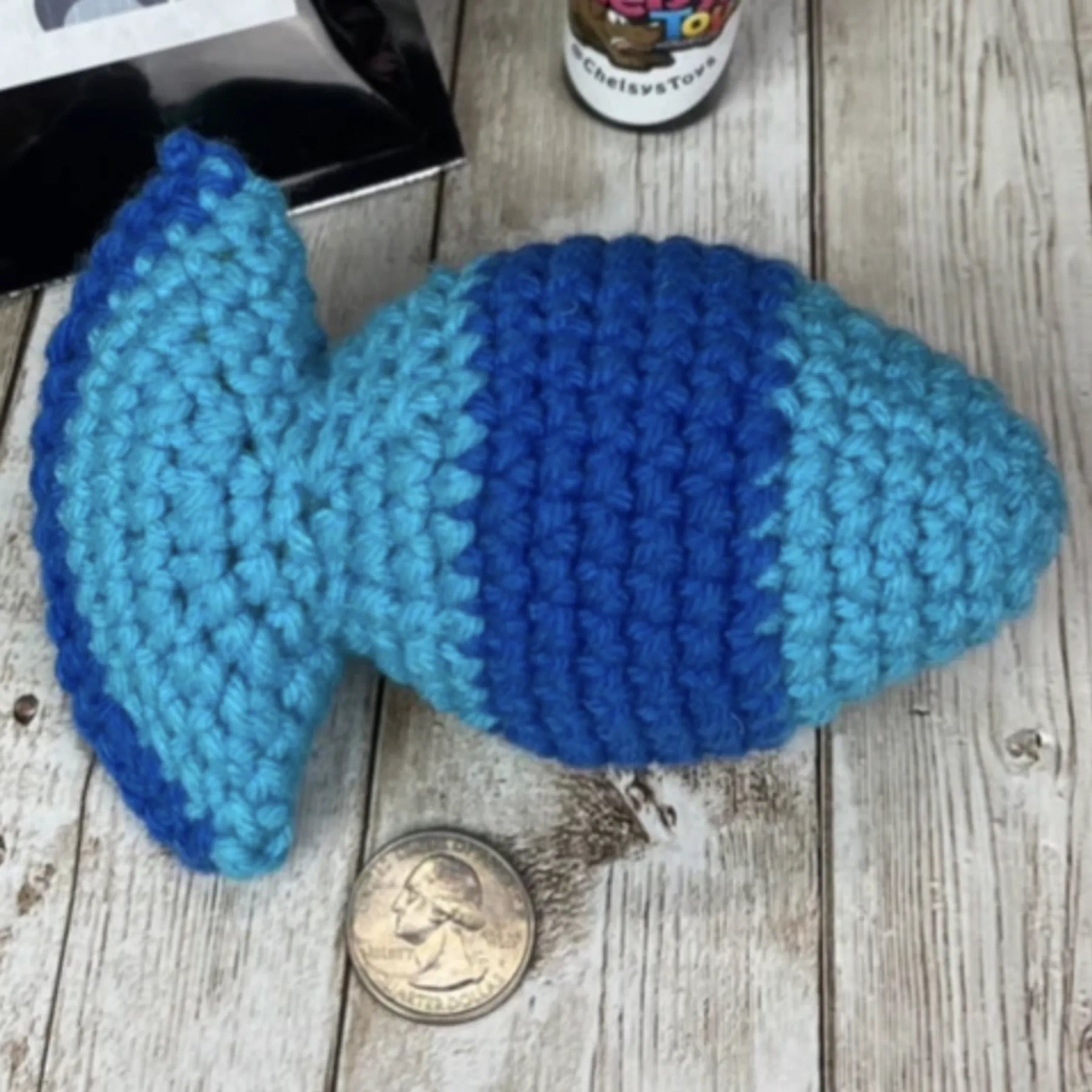 (1) Crochet Fish stuffed with catnip rolled polyfil (yarn; 6"L x 3.5"W x 4"H; MSRP $9.99)