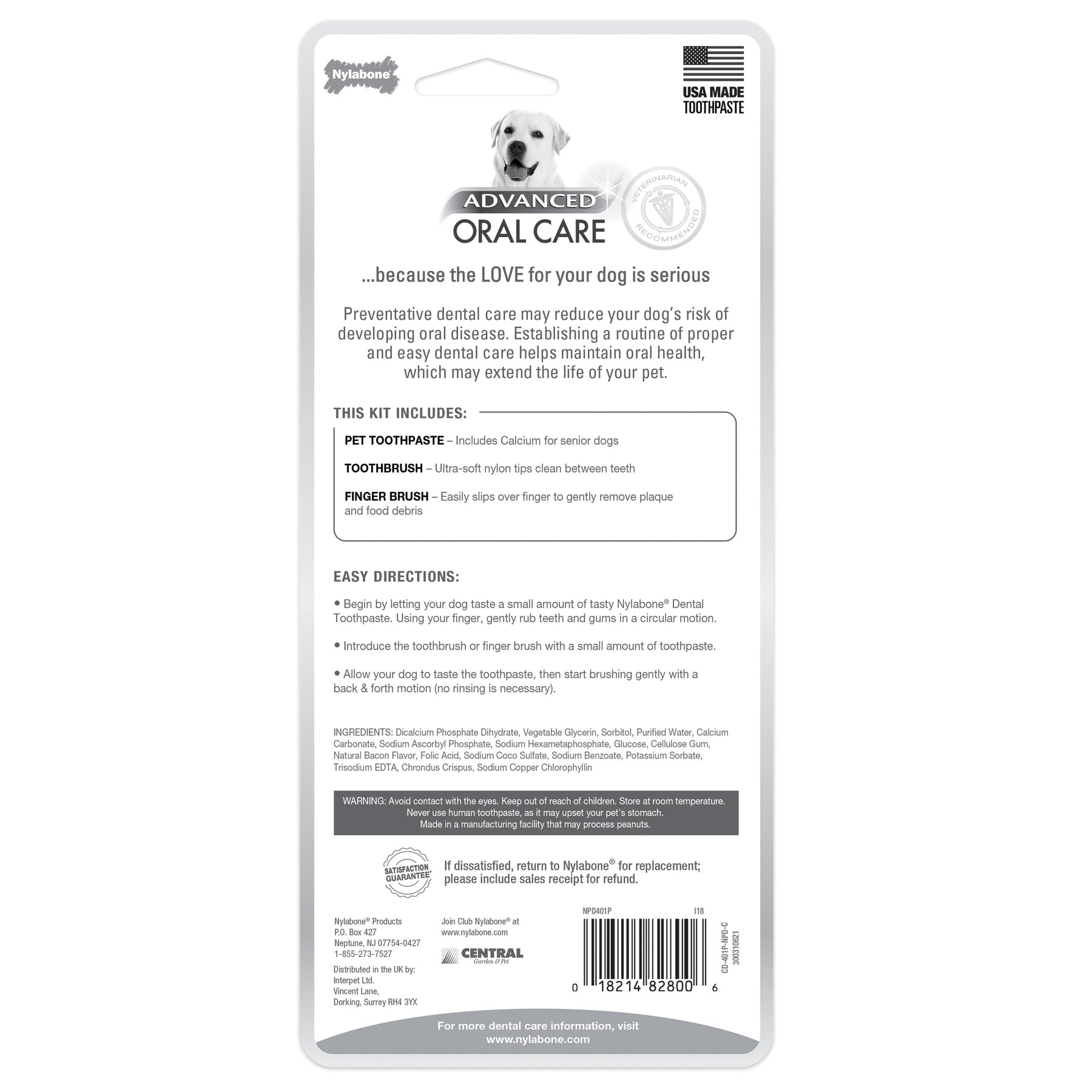 Help your elderly dog feel their very best with our Advanced Oral Care Senior Dog Dental Kit! This pack contains an angled toothbrush that helps you remove plaque and tarter from those hard-to-reach teeth. Plus, its designed with soft bristles that are gentle on sensitive teeth and gums. The senior dog toothpaste includes calcium to keep teeth strong, as well as Denta-C thats scientifically proven to help reduce plaque that harbors bacteria. Your best friend is sure to love its savory bacon flavor, too! Together, these dog dental tools promote preventative care, helping to lower the risk of periodontal disease. Vet recommended and pet parent approved, our senior dog toothbrush set makes dental care simple and convenient!Dicalcium Phosphate Dihydrate,Glycerin, Water, Sorbitol, Calcium Carbonate, Sodium Ascorbyl Phosphate, Sodium Copper Chlorophyllin, Sodium Hexametaphosphate, Folic Acid, Chondrus Crispus (Carrageenan), Glucose, Hydroxyethylcellulose, Sodium Coco-Sulfate, Trisodium Edta, Potassium Sorbate, Sodium Benzoate, and Flavor. Toothbrush Nylon and Rubber."