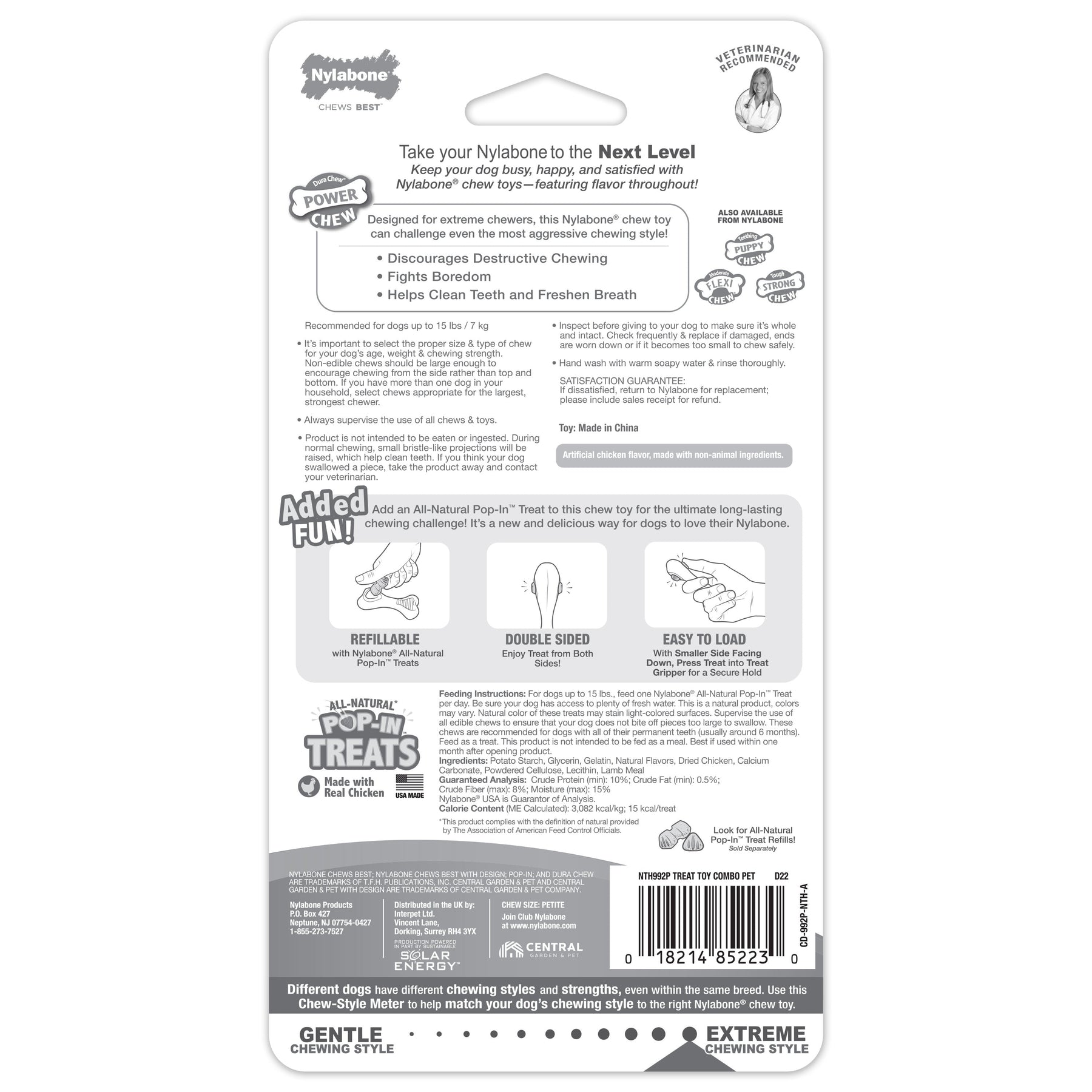 For decades; Nylabone has been creating chew toys that dogs love and pet parents trust. Give your dog the ultimate chewing challenge with the Power Chew Knuckle Bone and Pop-In Dog Treat Dog Toy Combo! Made of our toughest material; this chicken-flavored; long lasting chew toy is built for the most extreme chewers. The refillable dog chew toy is veterinarian recommended and features ridges and nubs to help clean teeth through chewing action. Plus; it includes All-Natural Pop-In Treats that fit securely in the treat grippers; allowing your dog to enjoy each treat from both sides. These limited-ingredient chicken dog treats are highly digestible and made in the USA. Whether you want to challenge your furry friend or simply reward them for being a good dog; this treat toy combo will keep them happy; busy; and satisfied.<-span>