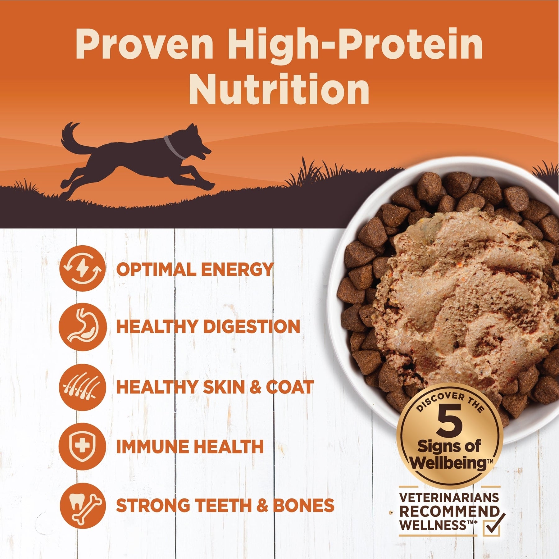 Combination Feeding: If feeding with Wellness dry food, reduce dry amount fed by 1/2 cup for every 6 oz of wet food.
