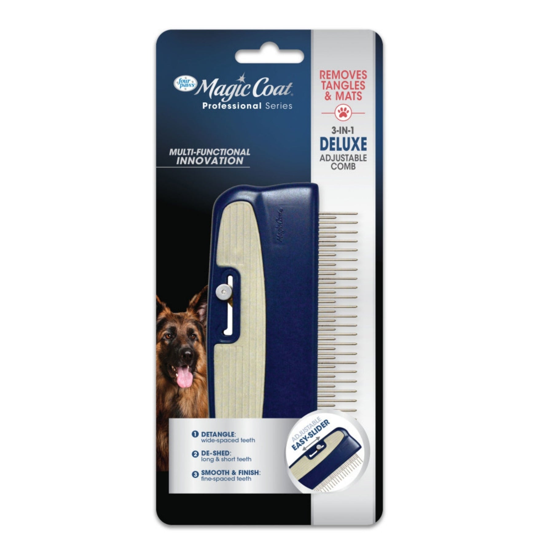 The Magic Coat Professional Series 3-in-1 Deluxe Adjustable Dog Comb for grooming is uniquely designed to conquer multiple coat-care needs with just one simple tool. Push the comb's knob to switch between 3 different grooming settings for teeth that detangle, de-shed, and smooth. Keep your best friend's coat soft and healthy with this versatile tool.