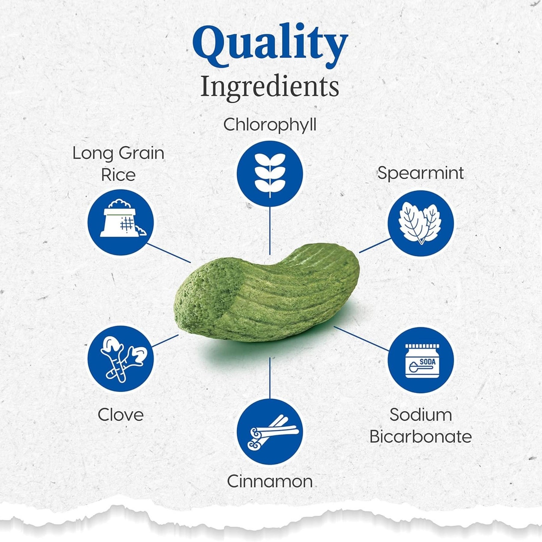 Rice flour, oat fiber, natural flavor, calcium bentonite, dicalcium phosphate dihydrate, monoglycerides, canola oil (preserved with mixed tocopherols), flax oil (preserved with mixed tocopherols), spearmint, sodium bicarbonate, cinnamon, clove, citric acid (a preservative), L-ascorbyl-2-polyphosphate, glucose oxidase, alfalfa (source of chlorophyll), rosemary extract.