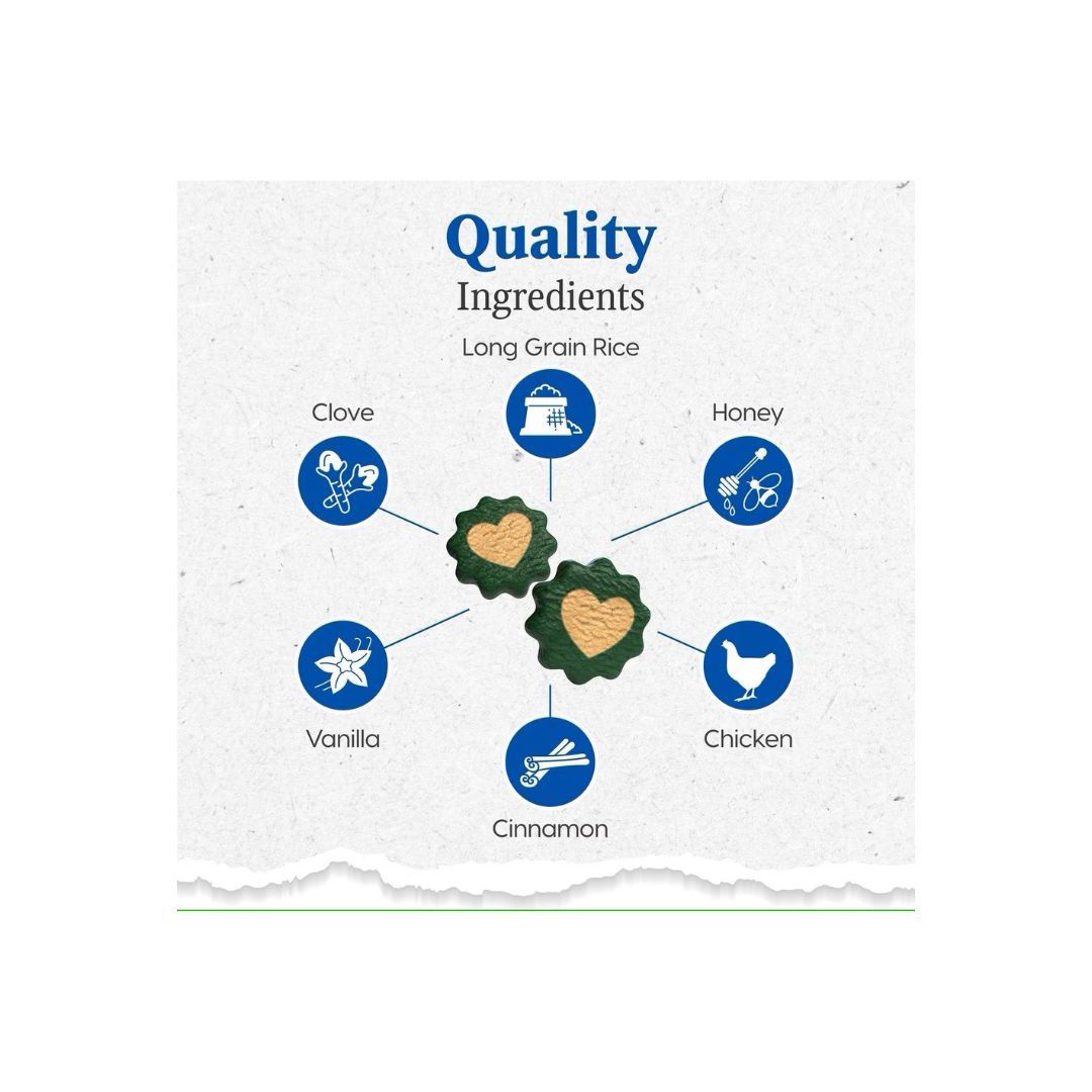 Long Grain Rice, Honey, Water, Chicken, Vegetable Glycerin, Canola Oil (Preserved with Mixed Tocopherols), Gelatin, Dried Proprionibacterium freudenreichii Fermentation Product, Citric Acid (Preservative), Lecithin, Flaxseed Oil (Preserved with Mixed Tocopherols), Salt, Cinnamon, Natural Flavors, Sodium Hexametaphosphate, L-Ascorbyl-2-Polyphosphate (Source of Vitamin C), Added Color (Fruit Juice, Turmeric), Clove, Vanilla.