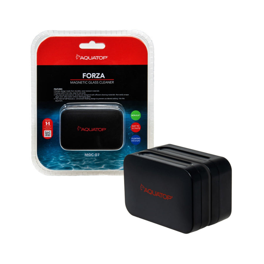 Aquatop Forza Floating Glass Cleaning Magnet for glass aquariums. Simple design made from durable, wear-resistant materials. Comes with 2 non-slip, easy-to-use pads. The internal and external brushes are designed with efficient cleaning materials that easily scrape algae and other stains without damaging glass. The internal half features a convenient floating design to prevent accidental sinking into the aquarium.