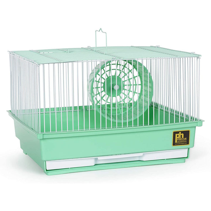 Prevue Pet Products single-story hamster & Gerbil Cage makes a great home for your hamster or Gerbil. Owner friendly features include a top-opening door, allowing you easy access into the cage, plus a removable bottom grille and pull-out tray for convenient cleaning. A color coordinated exercise wheel is included is to keep your hamster or Gerbil entertained while maintaining necessary activity levels. Ideal for hamsters and gerbils our single-story hamster & Gerbil Cage measures 14" Long, 11" Wide, 8 3/4" High with 3/8" Wire spacing.