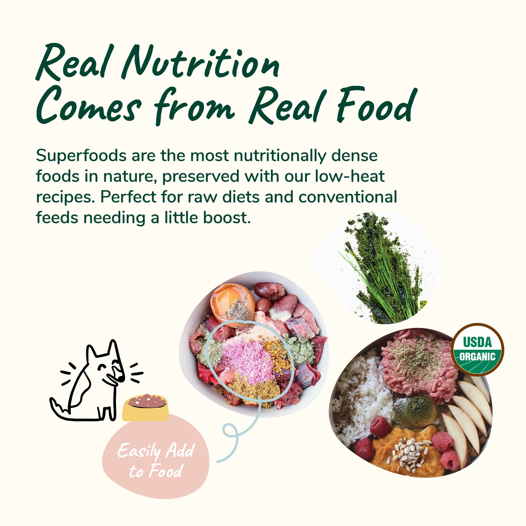 Real Supplementerfoods: Pets love our Supplementplements because they're made with only real Supplementerfoods and nothing else. No GMOs and no grains. They taste good and can be easily sprinkled on top of any type of diet.