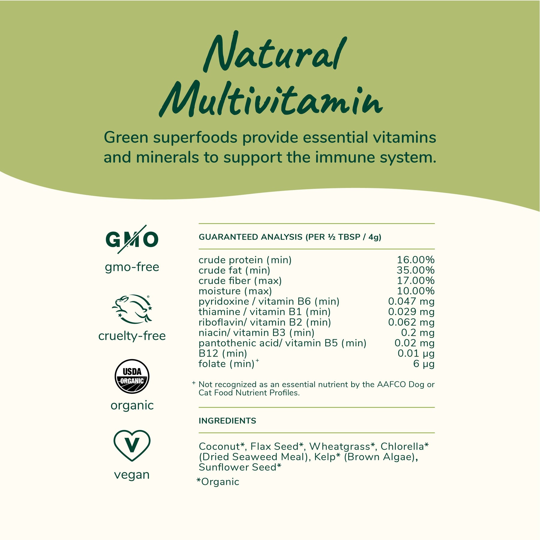 Natural Multivitamin: Supplementergreens like wheatgass and seaweed provide essential vitamins and minerals for healthy skin, coat, and energy levels.