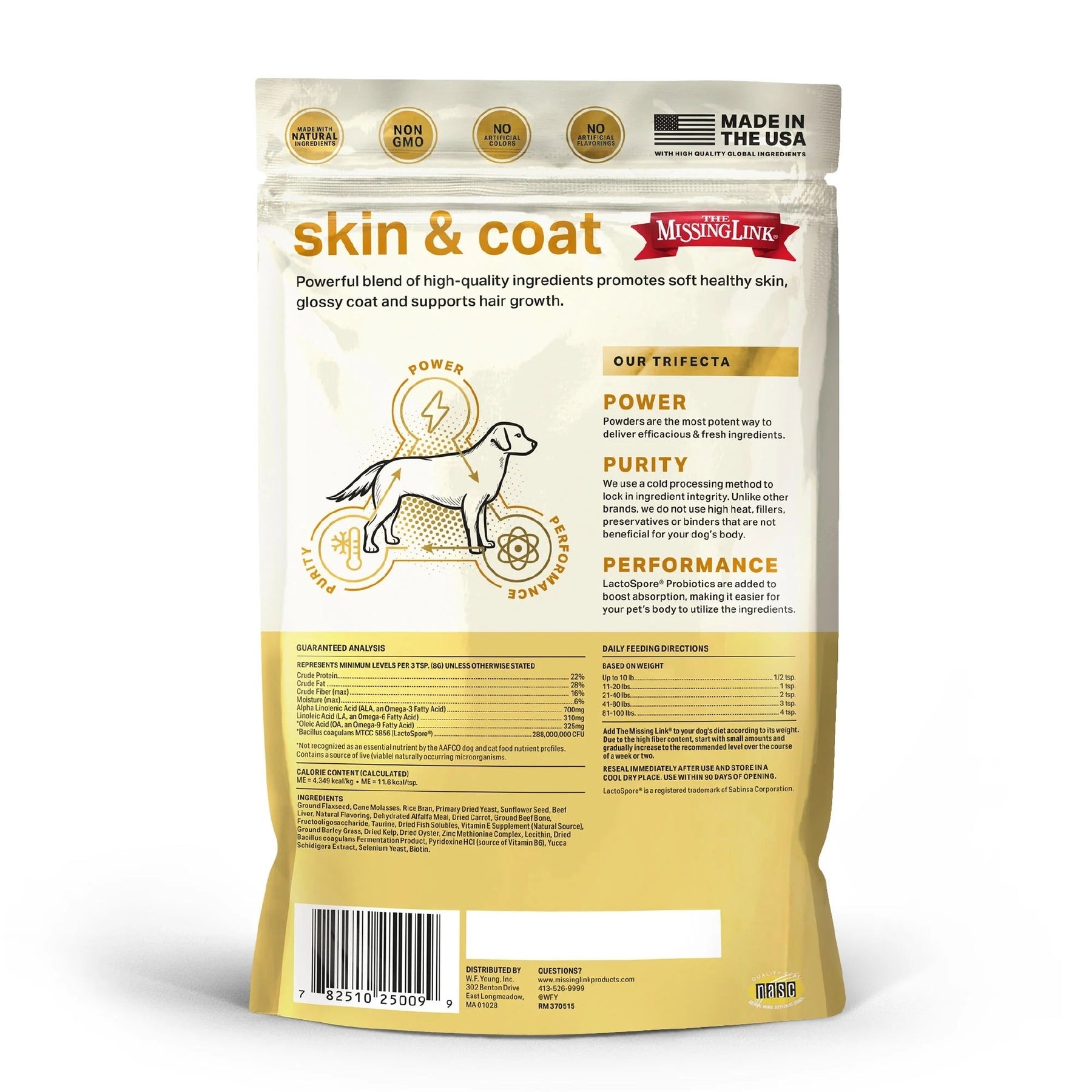 Add The Missing Link to your dog's diet according to its weight. Due to the high fiber content, start with small amounts and gradually increase to the recommended level over the course of a week or two. This product is intended for intermittent or supplemental feeding only.