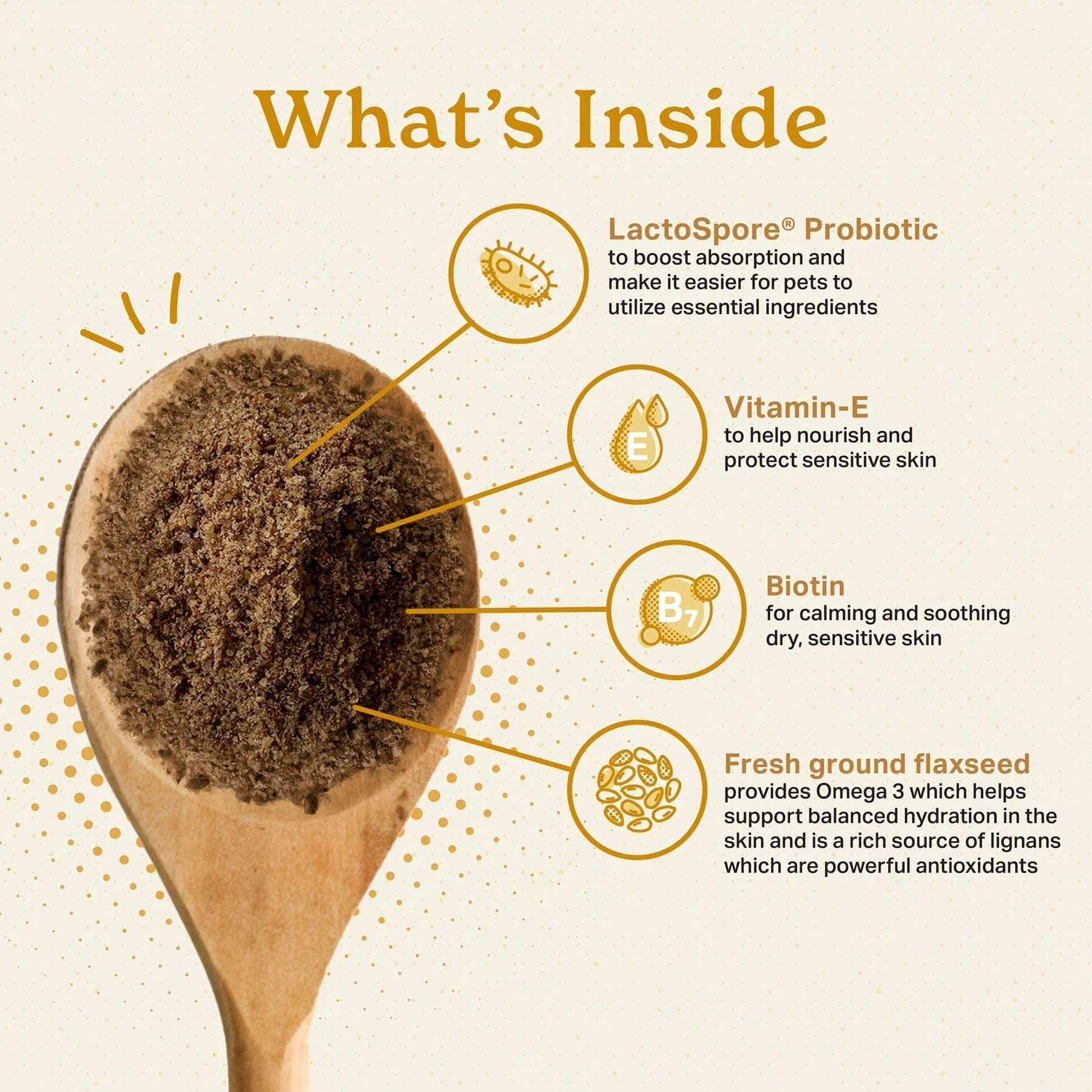 Ground Flaxseed, Cane Molasses, Rice Bran, Primary Dried Yeast, Sunflower Seed, Beef Liver, Natural Flavoring, Dehydrated Alfalfa Meal, Dried Carrot, Ground Beef Bone, Fructooligosaccharide, Taurine, Dried Fish Solubles, Vitamin E Supplement (Natural Source), Ground Barley Grass, Dried Kelp, Dried Oyster, Zinc Methionine Complex, Lecithin, Dried Bacillus coagulans Fermentation Product (Lactospore), Pyridoxine HCl (source of Vitamin B6), Yucca Schidigera Extract, Selenium Yeast, Biotin.