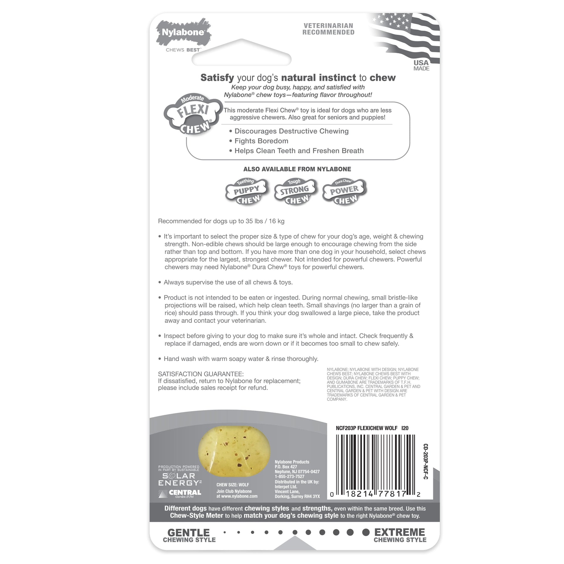 Nylabone FlexiChew chew toys are the perfect pastime for your moderate chewer! Our long lasting chew toy is made with a softer, flexible material for average lighter chewers, and it's packed with irresistible chicken flavor throughout. This flexible chew toy keeps dogs busy, satisfies their natural urge to chew, and encourages positive chewing habits. Good for gentle senior chewers, too. Not for powerful and aggressive chewers. Long lasting dog chew toy satisfies gentle moderate chewers|Durable soft dog bone keeps gentler chewers busy|Flexible chew toy satisfies the natural urge to chew|Made in the USA Dog chew toy is proudly made in the United States br/>Sold in Quantity of: 1