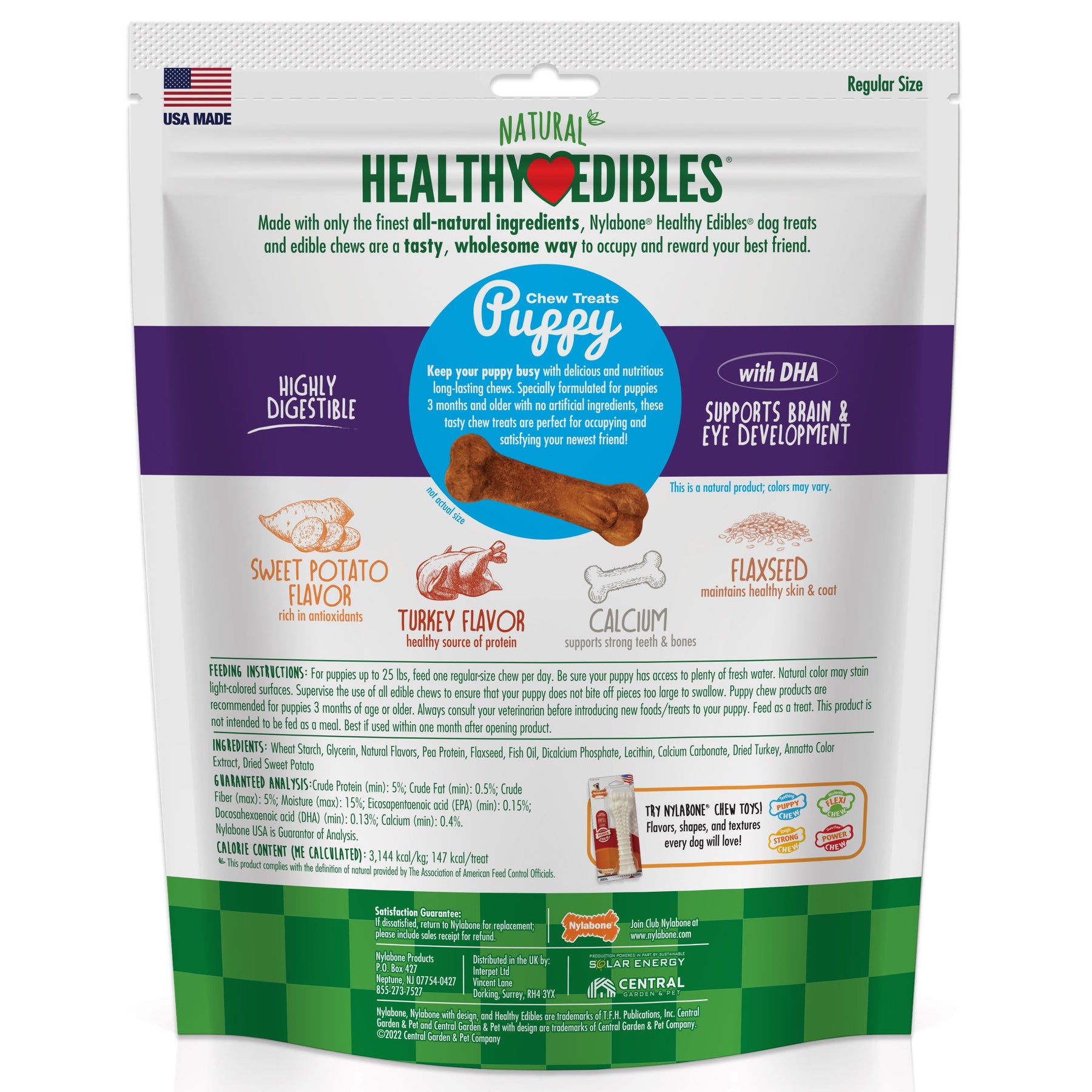 As a leader in the pet industry since 1955; Nylabone has been offering wholesome dog chew treats for decades. Specially formulated for puppies three months and older; Healthy Edibles Puppy Chew Treats help support furry friends wellness while providing a tasty way to occupy and reward. Each highly digestible; long-lasting chew treat contains DHA to aid in brain and eye development for growing pups. Plus; they include calcium to support strong teeth and bones and flaxseed to help maintain skin and coat health. These natural puppy treats do not contain any artificial ingredients for a guilt-free treating indulgence. Featuring delicious flavor pups love; these USA-made healthy puppy treats are sure to satisfy your new best friends cravings!