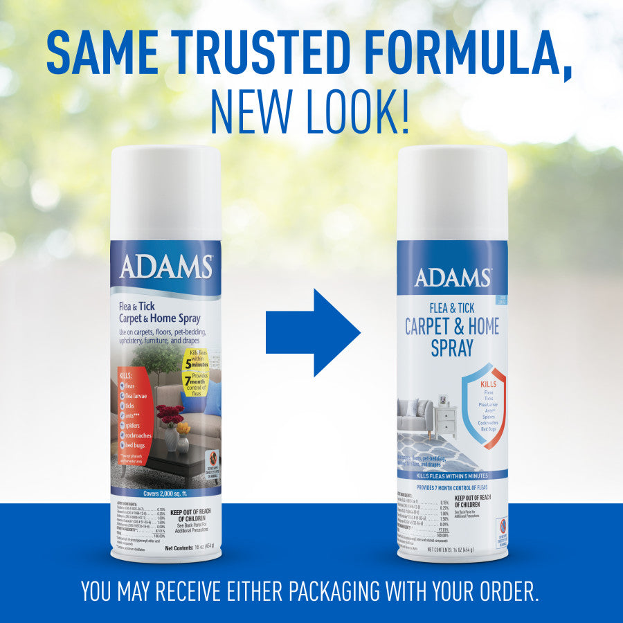 Protect your carpet and home from insect infestations. This spray has been proven to protect carpets, rugs, upholstery, drapes, around doors, windows, baseboards, in your garage, or any pet bed and pet kennel. Adams Flea & Tick Carpet & Home Spray provides up to 7 months of flea protection and kills fleas, flea larvae, ticks, ants*(*except pharaoh and harvester ants), spiders, cockroaches, and other listed insects. This spray is non-staining with no lingering odor. Adams Flea & Tick Carpet & Home Spray can be used indoors, but do not spray directly on animals. Adam Flea & Tick Carpet & Home Spray is designed to reach and kill pests hidden in your home and is an economical do-it-yourself pest control to have in your regimen. This spray treats approximately 2,000 square feet. With 5% of fleas living on your pet and the remaining 95% living in your home or yard, Adams products are designed to provide you with the power to prevent pests on every front. To complete your flea and tick control system try one of the many Adams flea and tick collars designed specifically for your dog, puppy, cat, or kitten.