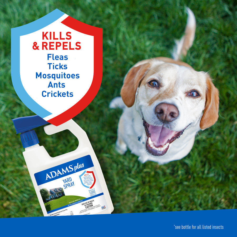 Help keep your pet happy and your backyard pest-free with the easy-to-use power of Adams Plus Yard Spray. You can say goodbye to the frustration of insect infestations ruining your outdoor get-togethers with this convenient and potent pest control spray. Adams Plus Yard Spray kills fleas, ticks, mosquitoes, fire ants, and many other insects that may infest the yard. The active ingredient, Permethrin, is a long-lasting insecticide that gives your yard 4-week control of many hard-to-kill sucking and chewing insects. This yard spray quickly and easily attaches to your garden hose, allowing you to treat up to 5,000 square feet per 32 ounce container. With 5% of fleas living on your pet and the remaining 95% living in your home or yard, Adams products are designed to provide you with the power to prevent pests on every front. To complete your flea and tick control system try Adams Flea & Tick Home Spray, specifically designed to use inside your home, and try one of the many Adams flea and tick collars designed specifically for your dog, puppy, cat, or kitten.