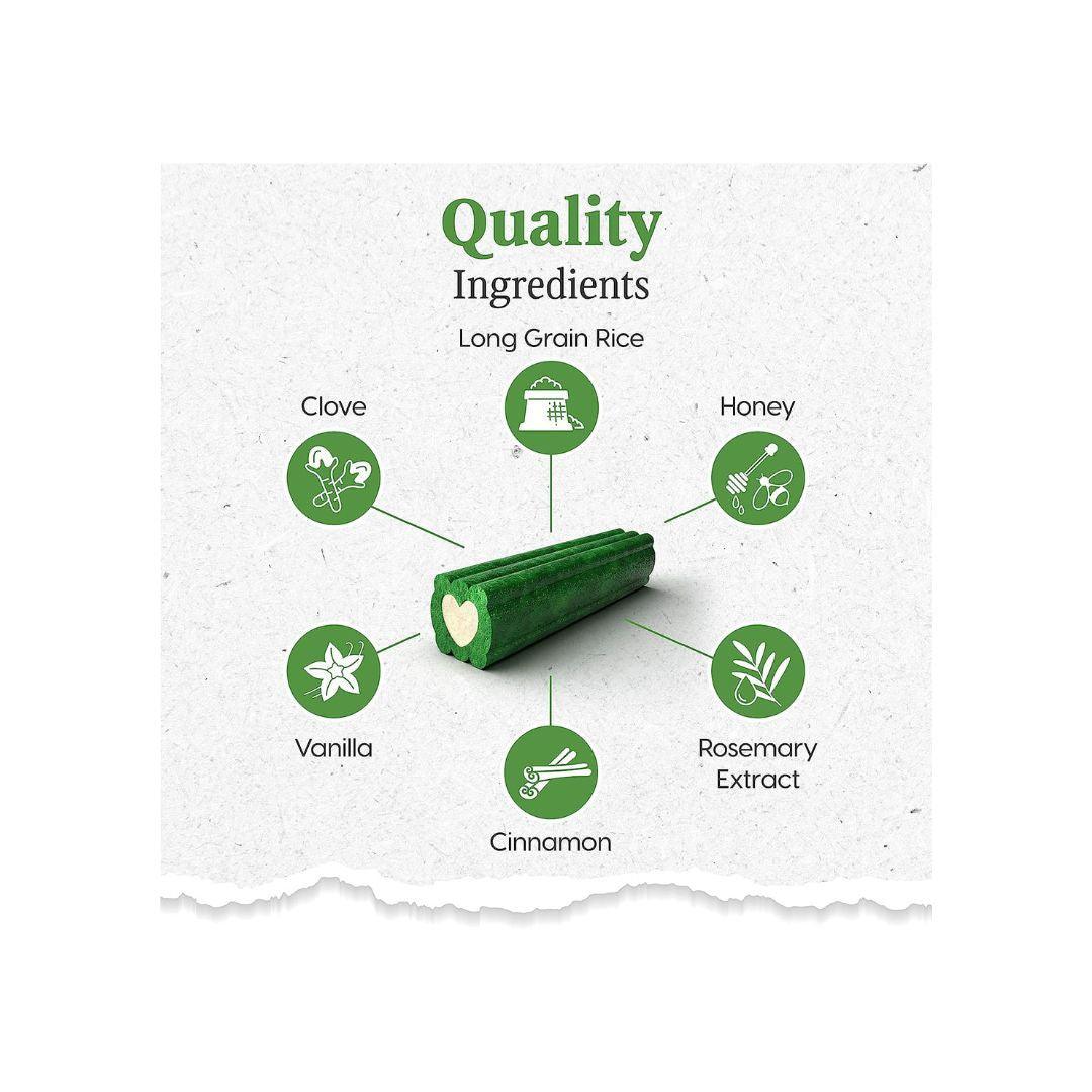 Our 4-in-1 Brushless Toothpaste dental chews clean, polish, and freshen breath! Their unique texture helps reduce plaque, tartar, and helps clean along the gumline as your dog chews. Plus – they are the only 4-in-1 dental chew that has a chewy toothpaste center that polishes teeth. Ranked Medium on our DENTA-METER, they are perfect for your everyday chewers!