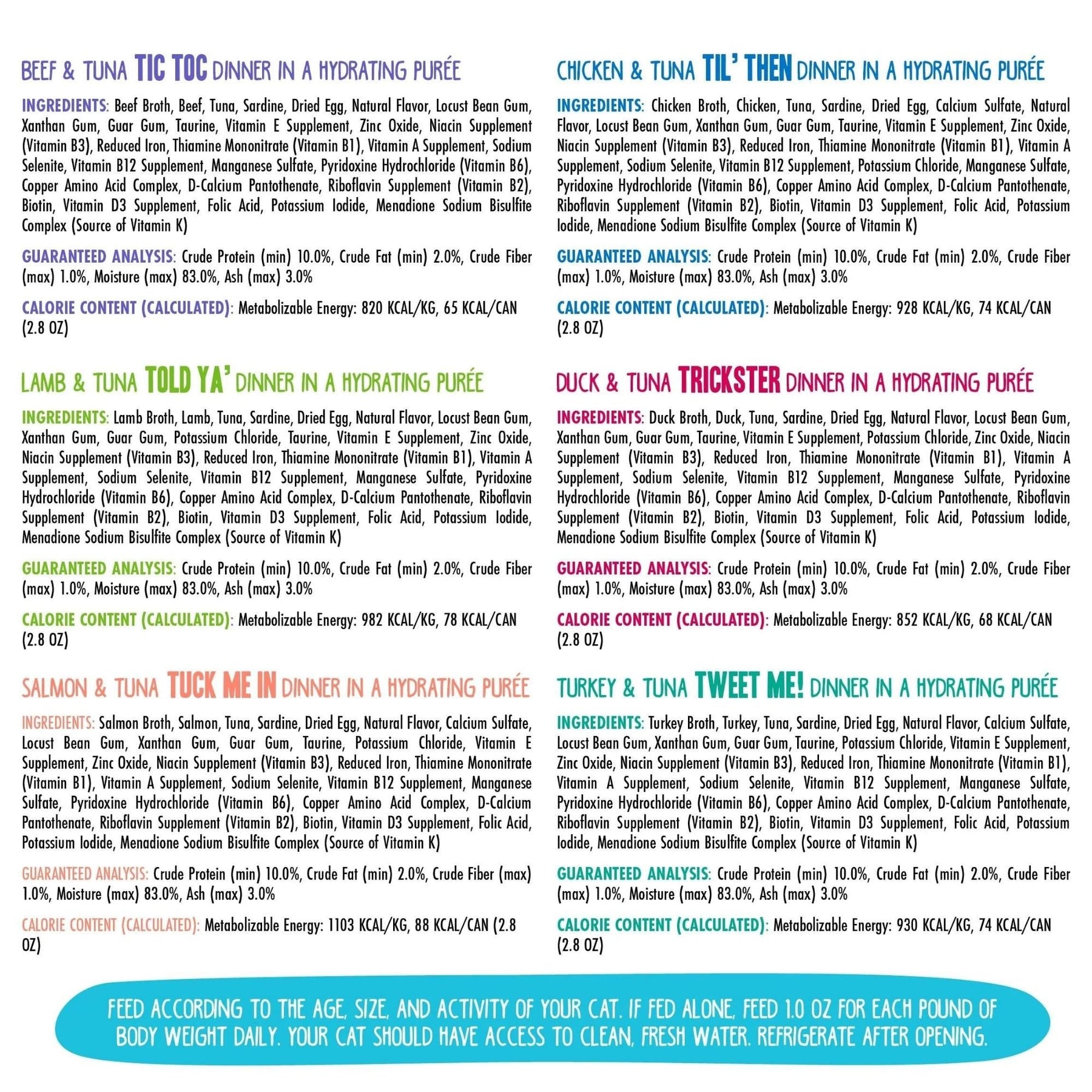 Feed according to the age, size, and activity of your cat. If fed alone, feed 1.0oz for each pound of body weight daily. Your cat should have access to clean, fresh water. Refrigerate after opening.