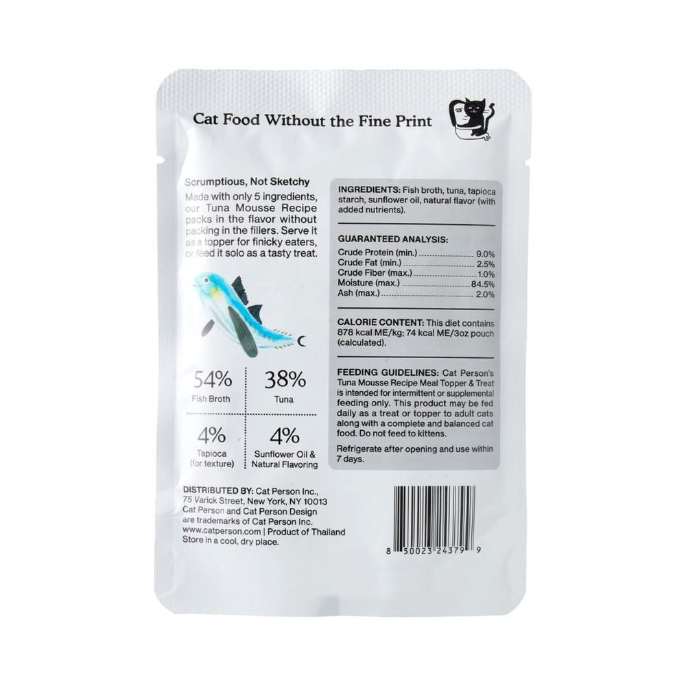 Cat Person Tuna Mousse Grain-Free Wet Cat Food Topper was designed to cater to both feline needs and the high standards of their human companions. This Mousse Topper is made with only a few carefully chosen ingredients, ensuring maximum flavor without any unnecessary fillers. You’ll like knowing that your four-legged family member is getting a nice boost of protein with essential amino acids. Your furry pal will enjoy the luxe and delicious flavor of this mousse. Whether used as a topper for picky eaters or as a standalone treat, Mousse Toppers are sure to please both furbabies and their pet parents.