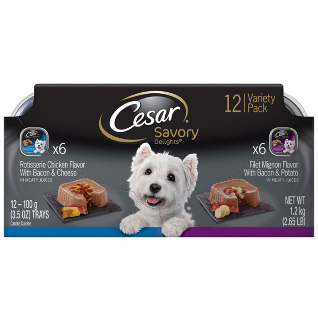 Dogs love variety. That's why CESAR SAVORY DELIGHTS Wet Dog Food in meaty juices now comes in a delicious variety pack featuring savory chicken and succulent steak flavors. Your dog can have their favorite flavors in a savory dog food that provides a complete and balanced meal just for them. CESAR SAVORY DELIGHTS Variety Pack Rotisserie Chicken & Filet Mignon Dog Food gives dogs the nutrition they need in the delightful flavors they crave. Served in convenient trays with no-fuss, peel-away freshness seals, the CESAR Brand makes mealtime easy. Best of all, our gourmet wet dog food uses ingredients formulated to meet nutritional levels established by the AAFCO dog food nutrient profiles for maintenance. Complete and balanced meal|Served in convenient trays with no-fuss, peel-away freshness seals|Formulated to meet nutritional levels established by the AAFCO dog food nutrient profiles for maintenance br/>Sold as 2 Piece(s)