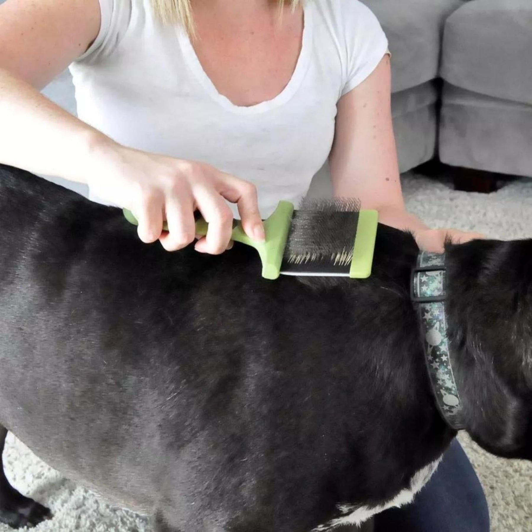 Use this brush regularly to keep your dog's coat healthy and beautiful! Reduces shedding to keep your dog and home clean. Flexible head contours to your dog for all-over grooming. Gently removes excess hair and tangles with stainless steel pins. Comfort-grip handle makes it easy to use. Keeps a variety of coat types healthy and beautiful.