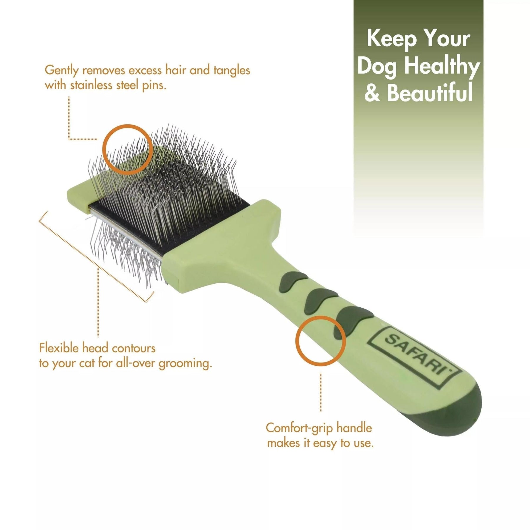 Give your dog the best grooming experience with the Safari Dog Flexible Slicker Brush! This brush features a flexible head that contours to your dog for all-over grooming. The stainless steel pins gently remove tangles and loose hair from every inch of your dog, providing added comfort in sensitive areas. Plus, the extra-long pins penetrate deep into the dog's coat to easily remove loose undercoat and reduce shedding. You'll love the soft feel of the comfort-grip handle while grooming.
