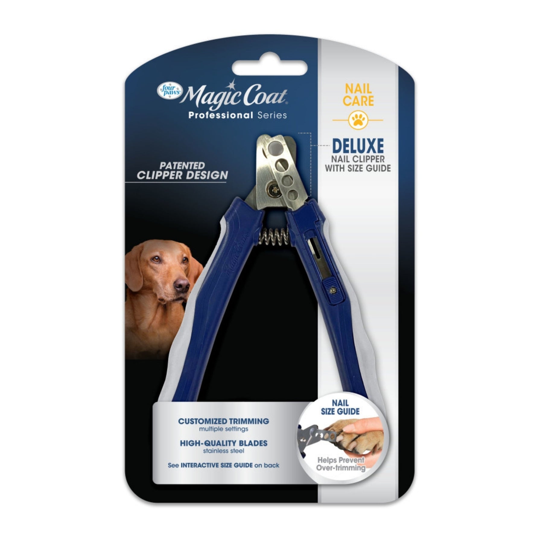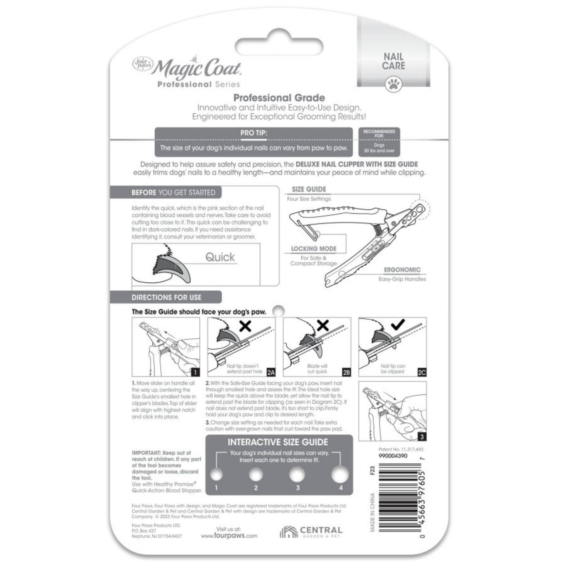 Clip your dog’s nails with accuracy and precision! The Magic Coat Professional Series Deluxe Dog Nail Clipper with Size Guide is a patented clipper design that helps prevent over-trimming. With 4 nail size settings, the Size Guide helps you trim each individual nail to a healthy length—and helps maintain your peace of mind along the way. This clipper is made with high-quality stainless steel blades and easy-grip handles for quality, salon-like grooming results you can achieve at home.