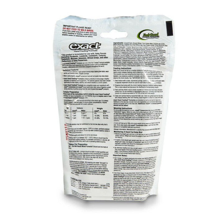 Kaytee exact Hand Feeding Formula was one of the first "instant" formulas available and is one of the most researched and respected products used by professional breeders, veterinarians and conservation programs throughout the world. exact foods high-nutrient formula promotes growth, weaning, development and bright plumage. When used properly, exact food will support healthy crop. exact Hand Feeding Formula contains probiotics to encourage a healthy population of intestinal microorganisms. The selected species have been chosen specifically for their vitality, stability, and overall benefits to a birds systemGround Corn, Ground Wheat, Corn Gluten Meal, Ground Oat Groats, Wheat Middlings, Soybean Oil, Dried Whole Egg, Soy Protein Isolate, Dried Molasses Beet Pulp, Soybean Meal, Ground Flax Seed (Source of Omega-3), Dicalcium Phosphate, Calcium Carbonate, L-Lysine, Wheat Germ Meal, Brewers Dried Yeast, Vitamin A Supplement, Salt, L-Arginine, Fructooligosaccharide, Choline Chloride, DL-Methionine, Potassium Chloride, Yeast Extract, Propionic Acid (Preservative), Vitamin E Supplement, Vitamin B12 Supplement, Riboflavin Supplement, Mixed Tocopherols (Preservative), L-Ascorbyl-2-Polyphosphate (Source of Vitamin C), Manganese Proteinate, Copper Proteinate, Ferrous Sulfate, Zinc Oxide, Manganous Oxide, Menadione Sodium Bisulfite Complex (Source of Vitamin K activity), Niacin, Rosemary Extract, Citric Acid, Ethoxyquin (Preservative), Calcium Pantothenate, Copper Sulfate, Pyridoxine Hydrochloride, Thiamine Mononitrate, Cholecalciferol (Source of Vitamin D3), Folic Acid, Beta-Carotene, Calcium Iodate, Biotin, Cobalt Carbonate, Sodium Selenite, Dried Aspergillus oryzae Fermentation Extract, Dried Bacillus subtilis Fermentation Extract, Dried Bacillus licheniformis Fermentation Product, Dried Bacillus subtilis Fermentation Product"