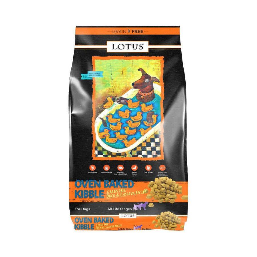 Feed your sensitive sidekick the grain-free nutrition she needs with the scrumptious flavor she loves! Lotus Wholesome Duck and Sweet Potato Recipe Grain-Free Dry Dog Food is oven-baked kibble that combines real duck and recognizable fruits and vegetables like peas; apple; blueberries; pumpkin and more! The beneficial blend of olive and salmon oils provides your pup with healthy omega fatty acids; while vitamins; antioxidants and nutrients help support her overall health. Plus; this kibble tastes just like an oven-baked duck cookie that your canine companion wont be able to resist!