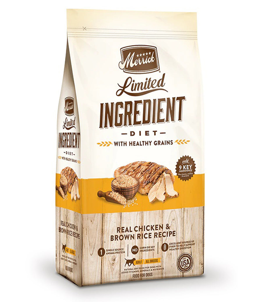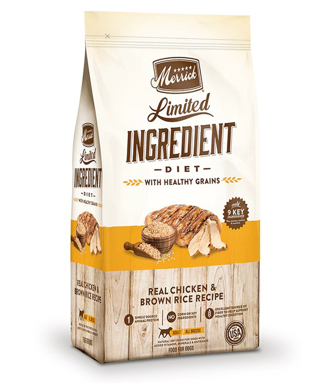 Merrick Limited Ingredient Diet Real Chicken & Brown Rice Recipe Dry Dog Food is specially formulated with a limited number of carefully selected ingredients to provide complete and balanced nutrition for dogs with food sensitivities and sensitive stomachs. Real deboned chicken is always the first ingredient. This single-source real deboned protein provides important amino acids, vitamins and minerals. This recipe contains leading levels of Omega-6 and Omega-3 fatty acids to aid in a healthy skin and coat and leading levels of glucosamine and chondroitin for healthy hips and joints. Merrick Limited Ingredient Diet Real Chicken & Brown Rice Recipe is made with only 9 key ingredients. All Merrick recipes are crafted in our Hereford, TX kitchen and cooked in the USA, in facilities that uphold strict FDA guidelines.