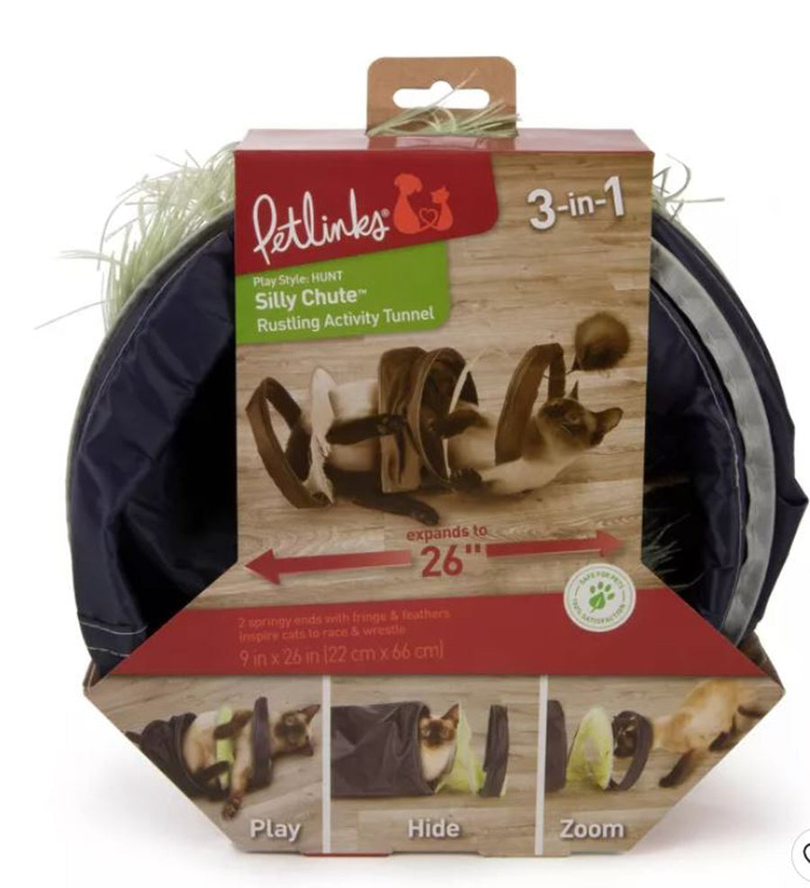 ",Petlinks? Silly Chute? Activity Cat Tunnel has crinkle, fringe, dangling ribbons, slinky like open springy end that really excites cats for endless pouncing, playing, batting, and hiding. This update on a favorite tunnel expands to 20 inches long when cats run through the tunnel a rustling sound is produced, a proven attractant to cats, it sounds like prey scurrying through the grass and leaves. Satisfy your cat's need for stimulation with our easy to expand and collapse Silly Chute? Activity Tunnel."