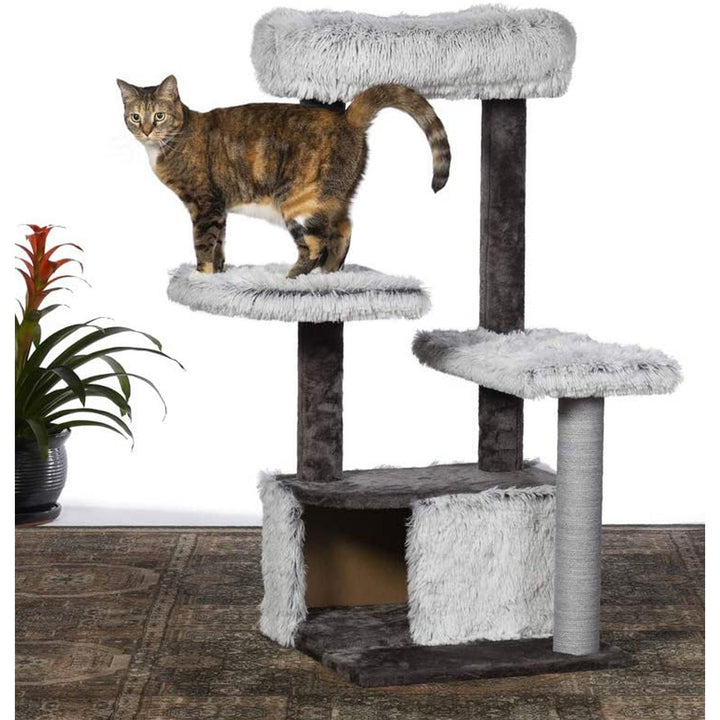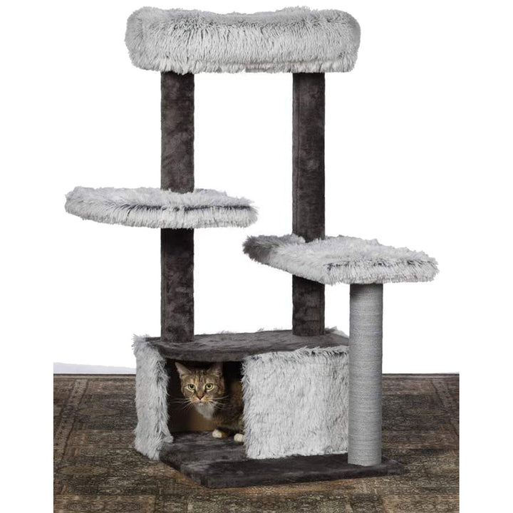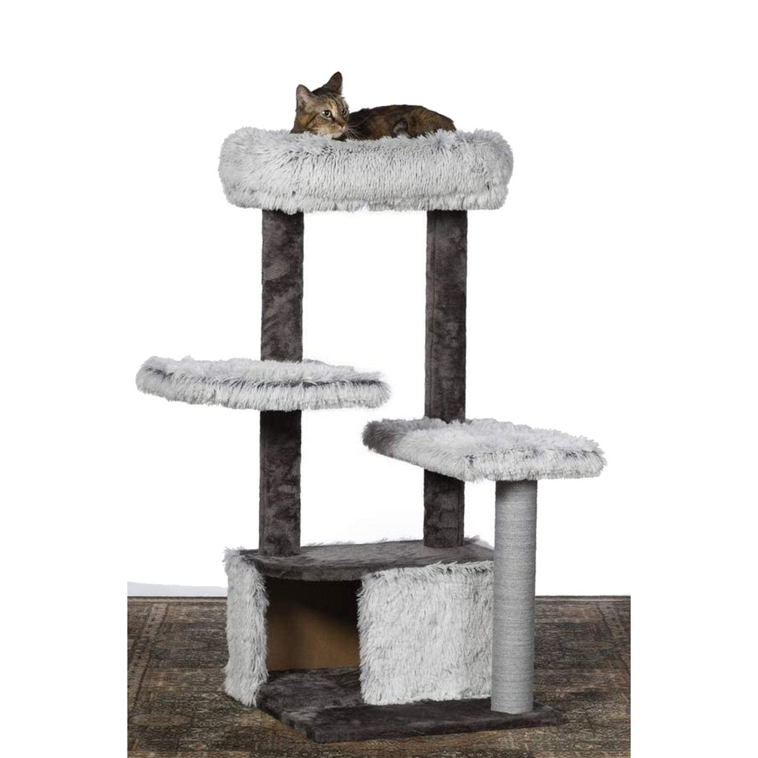 Prevue Pet Products Frosty Lounge 7323 combines super soft, plush fabrics with durable jute to provide the perfect place for lounging, sleeping, scratching, hiding, and playing. Our Frosty Lounge measures 3 1/2 feet tall A large plush bolstered day bed is a great spot for your kitten or cat to survey its surroundings or take a cat nap. Shag covered platforms provide opportunities for pouncing and jumping or multiple levels for more than one cat to lounge comfortably. Our cozy cave, lower level, hideaway makes your cat or kitten feel more secure and minimizes social stress. Rugged jute rope scratching post offers an appealing texture to cats, curbing inappropriate scratching behaviors. Our Frosty Lounge comes in dark gray and frost white and is a warm and welcoming addition to any home decor. Prevue Pet Products Frosty Lounge 7323 measures 29 1/4 inches Long, 19 1/4 inches Wide and 43 inches High.