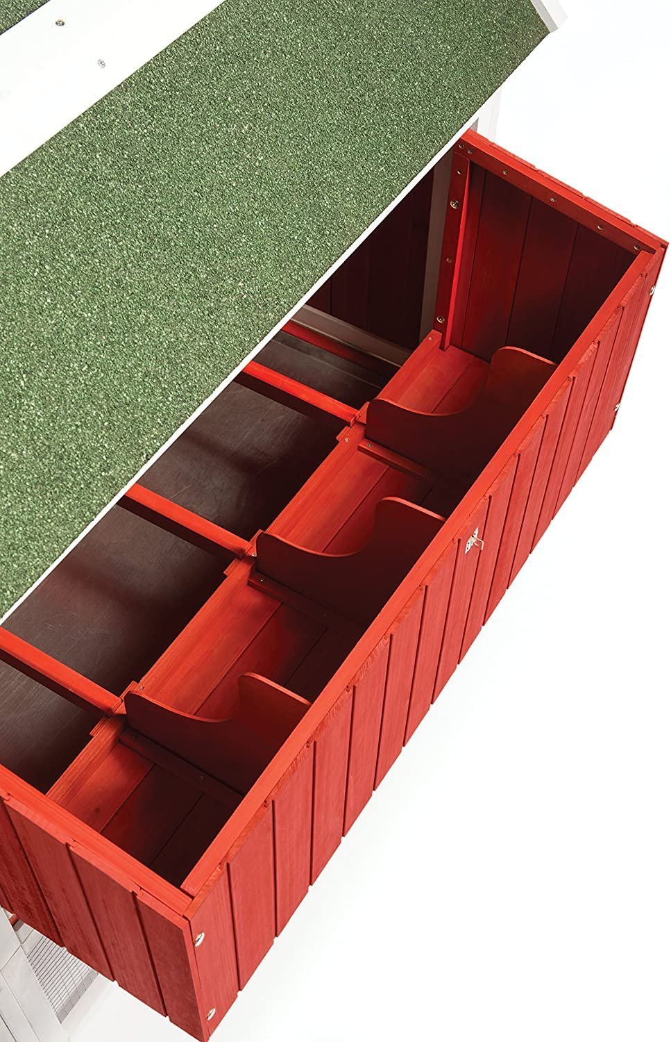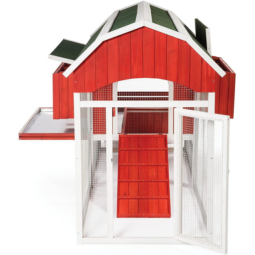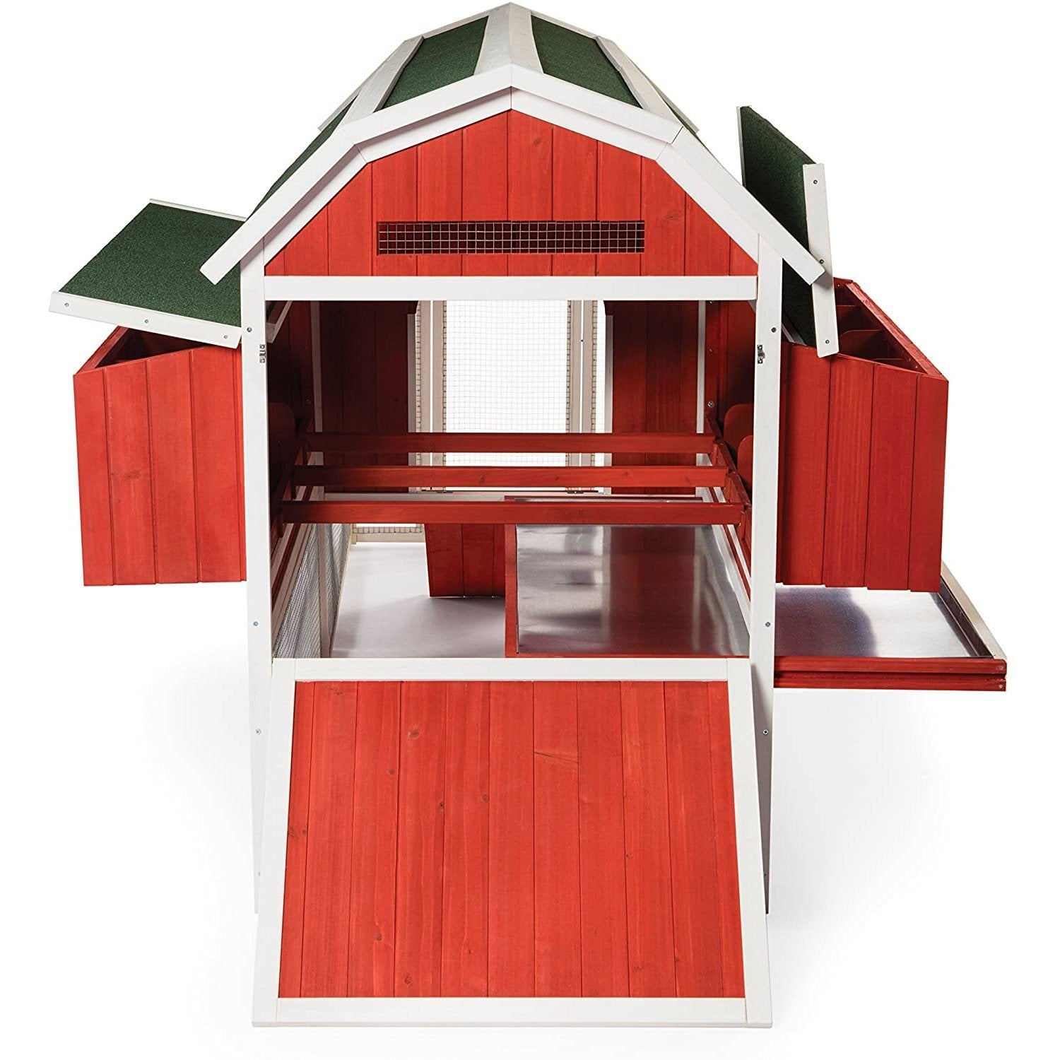 Prevue Pet Products large Red barn chicken coop 467 - inspired by the traditional Red barn found on many farms, our large chicken coop offers lots of living space while remaining compact enough to fit in an urban farm environment. Our thoroughly constructed design combines safety and security for your hens with modern and convenient features for you. There's plenty of room to roam in the protected chicken run while still allowing your flock access to the grass, ground and outdoors. Leave the front access door open for come & go activity or secure with the attached bolt-lock to protect from predators. A ventilated roosting area provides air circulation and light and includes three roosting bars plus an under-coop removable tray for interior cleaning. The large back-panel door gives you full entry to the roosting area and is secured with two bolt-lock closures. Adjacent to the roosting area, two nest boxes contains four nesting slots with each slot measuring approximately 9 ½” in width. Nest box lid lifts easily, or can be fully removed, for egg removal and can also be locked for additional security. Spacious enough for 8 – 10 hens, a traditional barn Red, non-toxic, stain is complimented by a green asphalt roof to keep the coop's interior cozy and dry. Heavy enough to prevent predators from lifting it, but easy enough for two people to Reposition. Prevue Pet Products large chicken coop 467 is easily assembled and includes step-by-step instructions. To maintain the longevity of your purchase, we recommend that you periodically treat it with a non-toxic sealant, and protect it with a tarp or other covering during extended periods of inclement weather. Coop measures 90 1/2'' long, 54''wide and 51 1/2'' high.