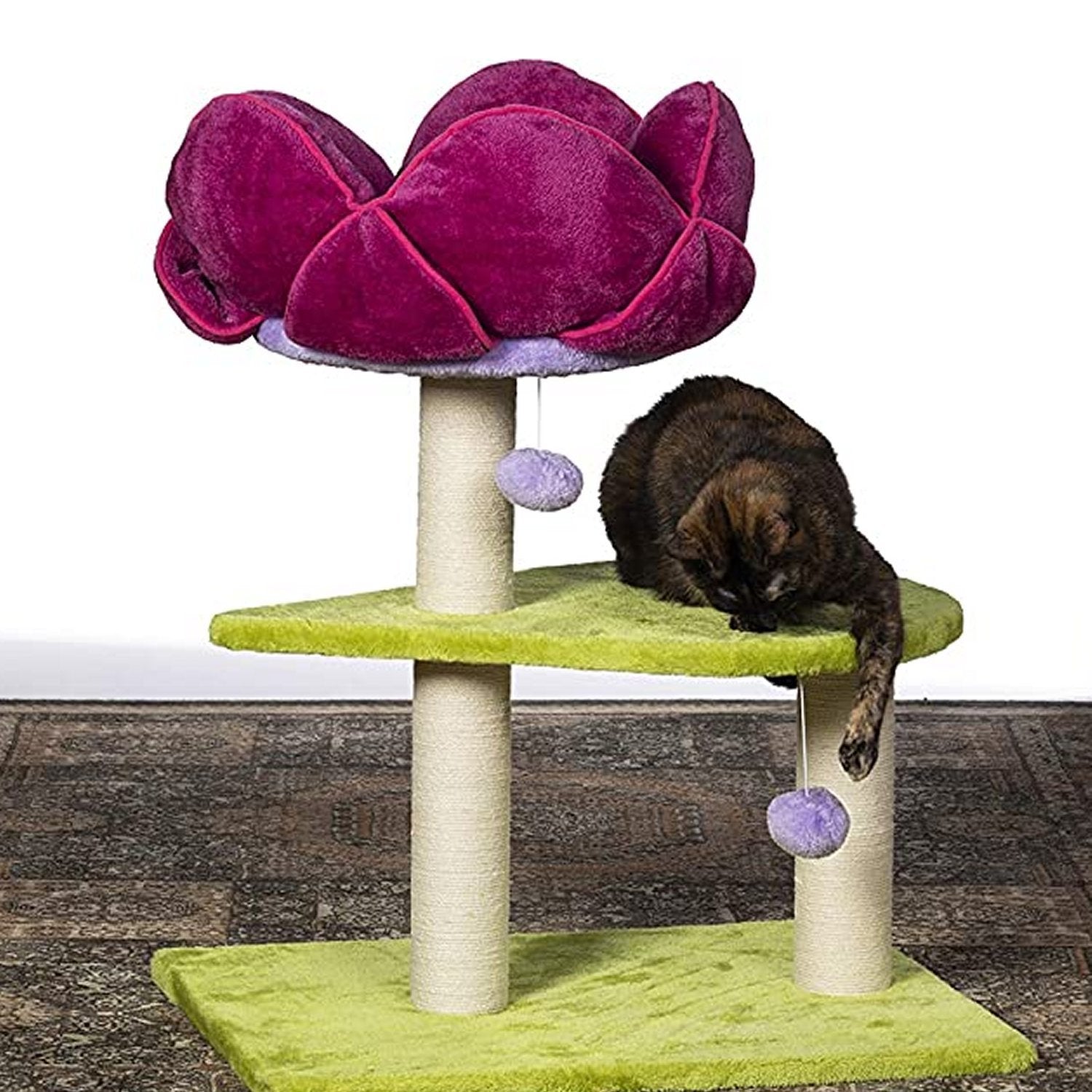 Prevue Pet Products Flower Power 7320 combines super soft, plush fabrics with durable jute to provide the perfect place for your cat to sleep, lounge and play. Two plush, dangling swat toys and lounging platform provide opportunities for pouncing and jumping. Two individual, natural, jute rope scratching posts offer an appealing texture to cats, curbing inappropriate scratching behaviors. Our incredibly plush flower bed encompassed in velvety soft pillows to surround your feline in total comfort while making your cat or kitten feel more secure and less vulnerable to sneak attacks. Our whimsical flower design in bold shades of fuchsia and lime green is sure to add a delightful presence to any room. Prevue Pet Products Flower Power 7320 measures 23.5 inches Long, 17.75 inches Wide, and 28.12 inches High.