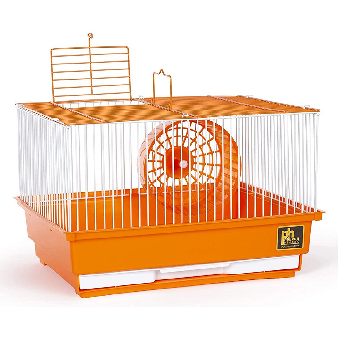 Prevue Pet Products single-story hamster & Gerbil Cage makes a great home for your hamster or Gerbil. Owner friendly features include a top-opening door, allowing you easy access into the cage, plus a removable bottom grille and pull-out tray for convenient cleaning. A color coordinated exercise wheel is included is to keep your hamster or Gerbil entertained while maintaining necessary activity levels. Ideal for hamsters and gerbils our single-story hamster & Gerbil Cage measures 14" Long, 11" Wide, 8 3/4" High with 3/8" Wire spacing.