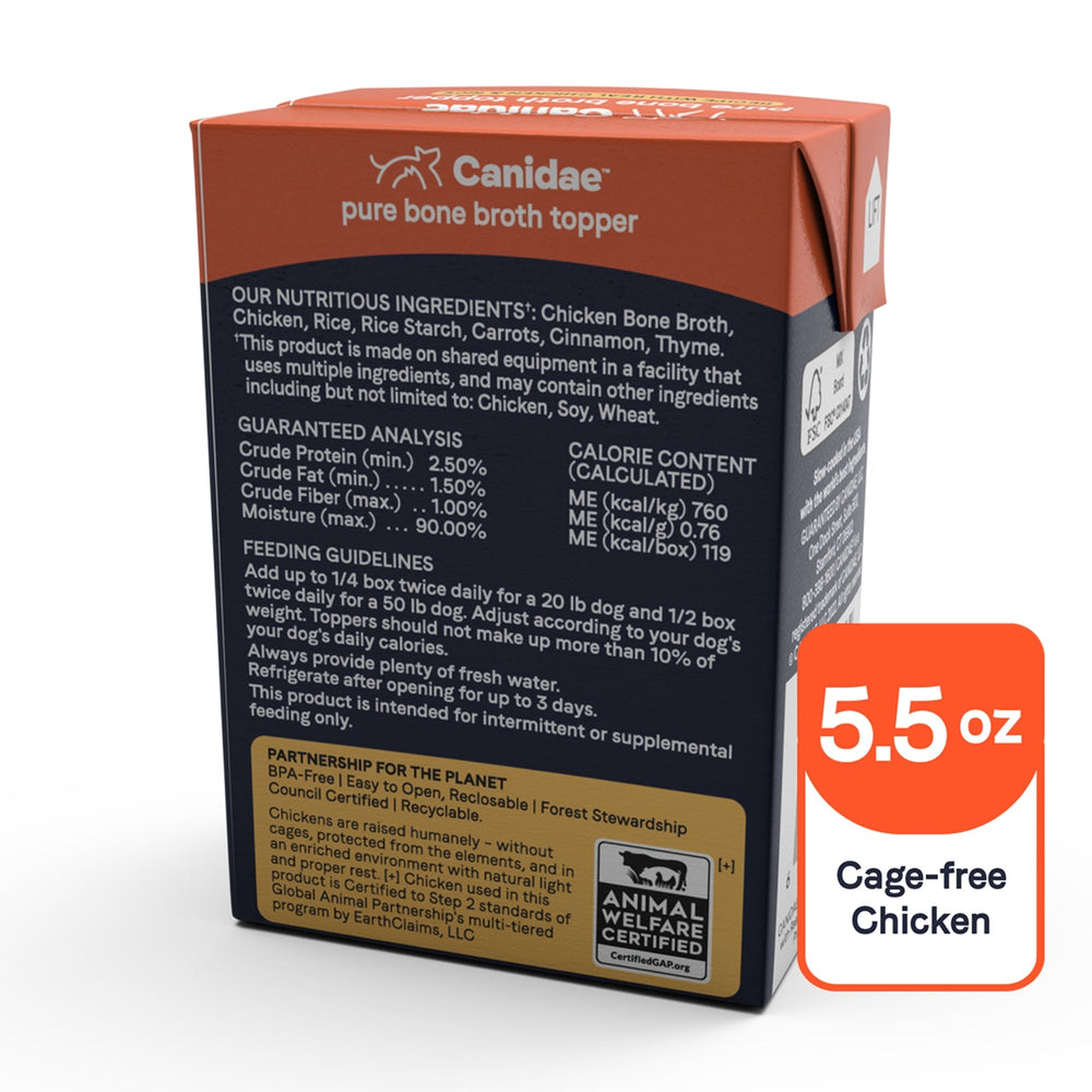 Nourish your dog with Canidae's Pure Chicken Bone Broth Toppers cooked with real bone broth and wholesome grains. Slow cooked in the USA using responsibly-sourced cage-free humanely raised chicken and wholesome ingredients including rice and carrots. Serve as a snack or add on top of kibble for a delectable meal. Perfect for a dog of any life stage.