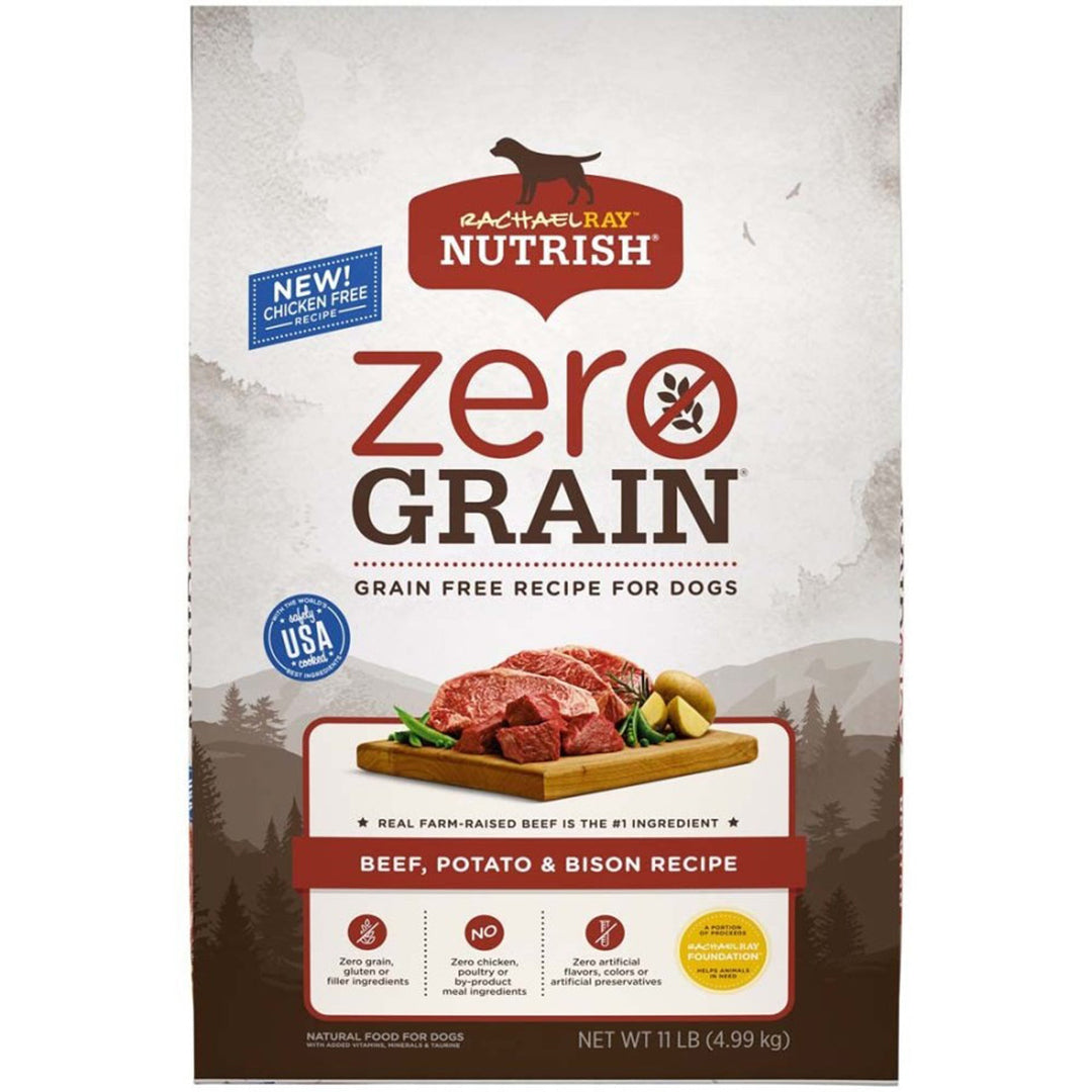 When you're serving up Rachael Ray Nutrish Zero Grain Beef dry dog food, you can hear the little pitter patter of paws move a little bit quicker as your furry gang runs to gobble up their favorite meal. Made with real beef as the number one ingredient, this premium dry dog food also provides added vitam Contains one (1) 11-pound bag of Rachael Ray Nutrish Zero Grain Natural Premium Dry Dog Food, Grain Free, Beef, Potato & Bison dry dog food - a new and updated recipe|U.S. farm-raised beef is the #1 ingredient|No poultry by-product meal, artificial preservatives, colors, or artificial flavors br/>Sold in Quantity of:1