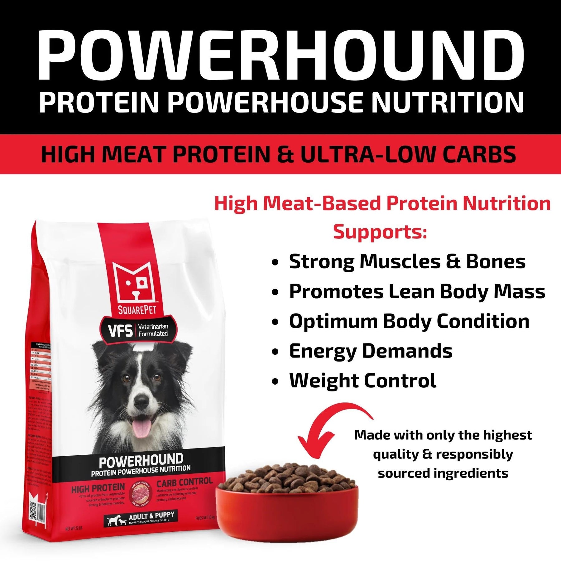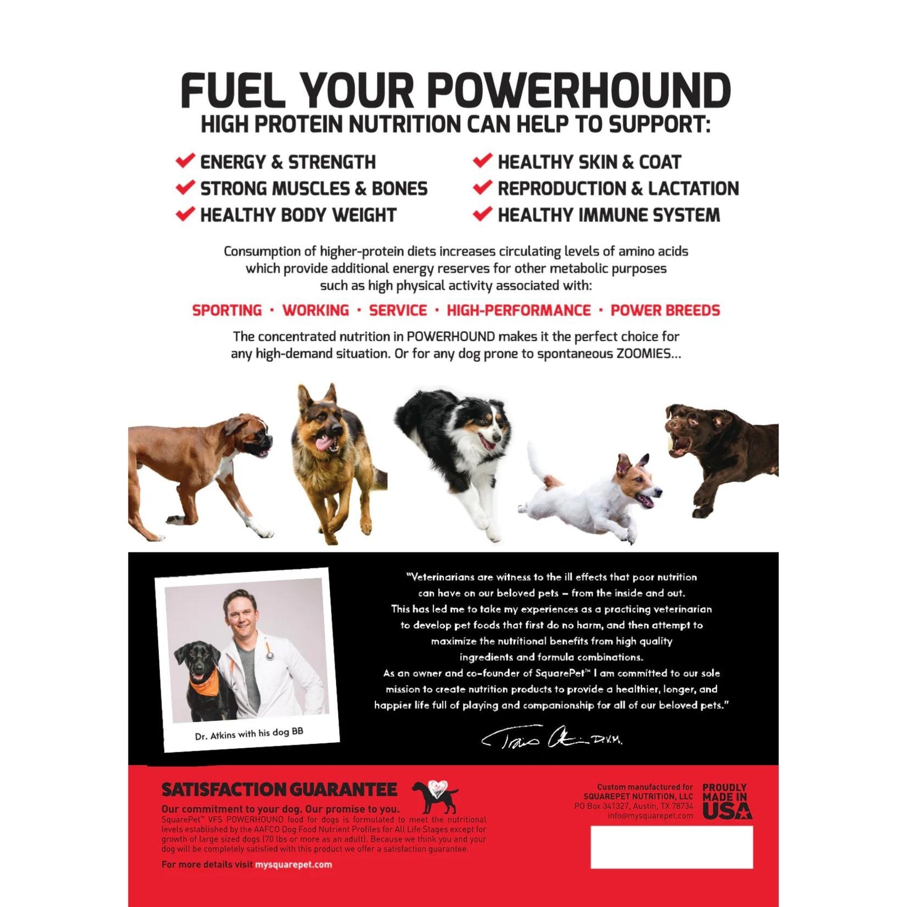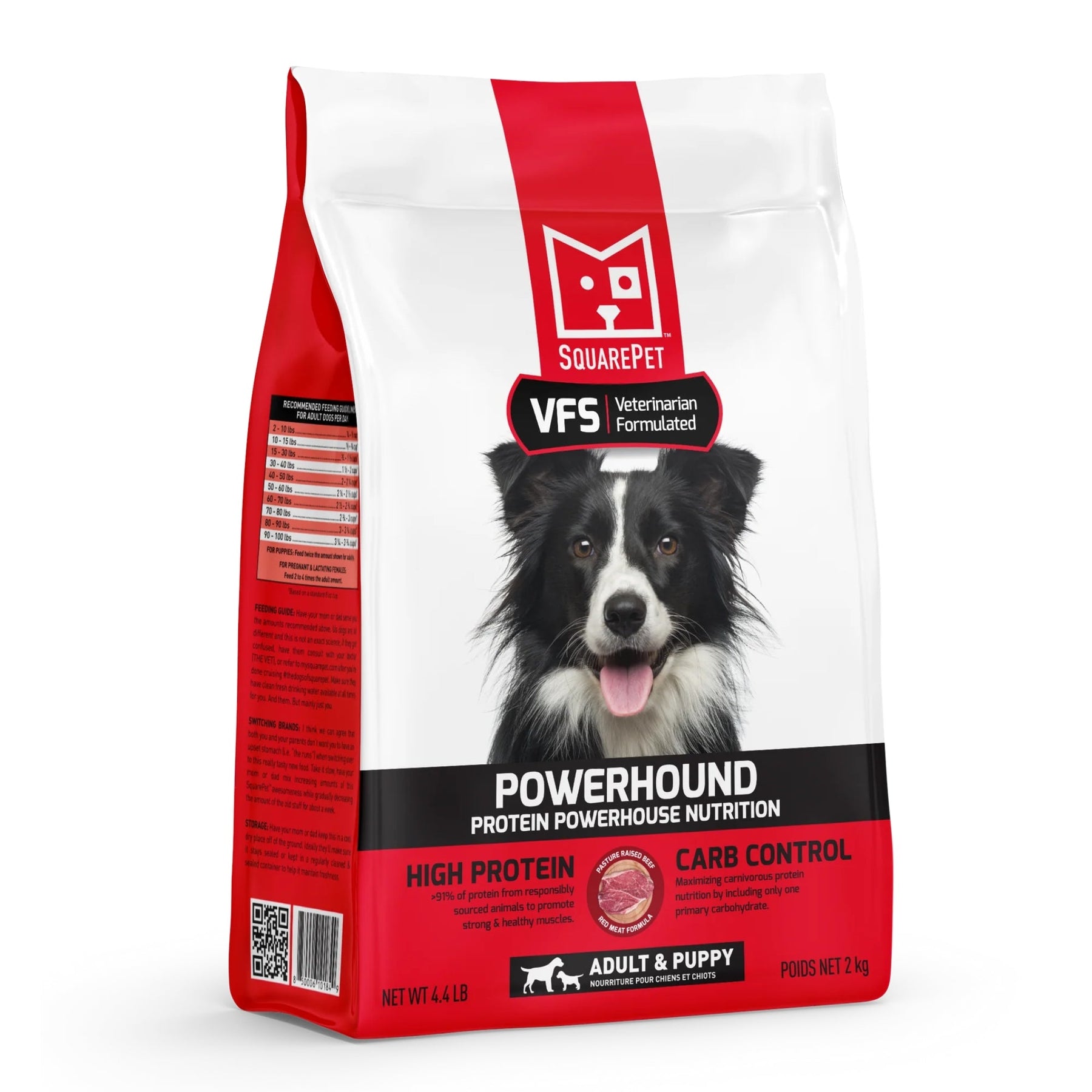 Square Pet VFS POWERHOUND food for dogs is formulated to meet the nutritional levels established by the AAFCO Dog Food Nutrient Profiles for All Life Stages except for growth of large sized dogs (70 lbs. or more as an adult).