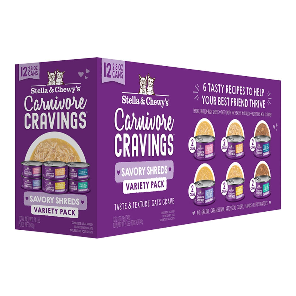 Your little hunter cannot wait to sink their teeth into Stella & Chewy's Carnivore Cravings Savory Shreds Variety Pack Cat Food! These tender, protein-rich shreds are simmered in a savory broth to deliver a special meal even the most finicky felines can enjoy. Carnivore Cravings feature the real meat and texture your cat craves with the nutrients they need to thrive. Each bite works to promote healthy digestion, strong teeth and gums, vibrant skin and coat plus stamina and vitality. Plus, it contains no grain, gluten, carrageenan or unnecessary fillers, so it's easy for felines of all life stages to digest. The Savory Shreds variety pack includes the following recipes—Cage-Free Chicken and Chicken Liver, Cage-Free Chicken and Salmon, Cage-Free Chicken and Turkey, Cage-Free Chicken & Grass Fed Beef, Tuna and Salmon plus Tuna and Mackerel. Shredded muscle meat slowly simmered in a savory broth with bits of pumpkin delivers a special meal that will get your cat purring! Carnivore Cravings provide essential hydrating moisture for cats and can be served as a complete meal, food topper or treat. Tender and moist, this light, meaty meal is made with natural ingredients and appeals to even the pickiest cats and kittens. Formulated to fuel your cat’s wild side, the Carnivore Cravings Savory Shreds variety pack includes cage-free poultry, grass-fed beef and wild-caught fish. Contains no grain, gluten, carrageenan or unnecessary fillers, so it's easy for felines of all life stages to digest.
