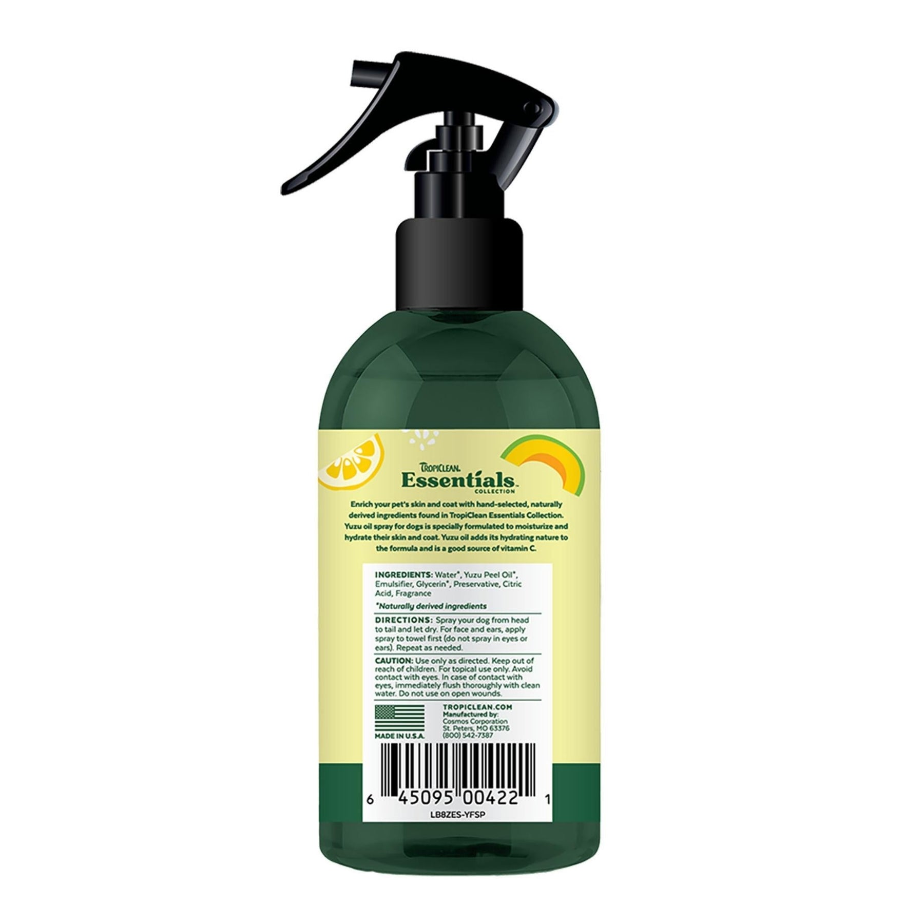 Enrich your pets skin and coat with hand-selected, naturally derived ingredients found in TropiClean Essentials Collection. Specially formulated Yuzu oil spray for dogs helps moisturize and hydrate your pet’s skin and coat. Yuzu oil adds its hydrating nature to the formula and is a good source of vitamin C. This grooming spray has a pleasant perfume of Sweet Yuzu & Melon. Moisturinzing - Yuzu Oil contains vitamins C & E that help moisturize the coat Hydrating - Potassium & magnesium found naturally in Yuzu Oil helps to hydrate the skin Safe Solution - Sulfate free, Paraben free, Phthalate free, Dye free and Soap free Essential Scent - Sweet Yuzu & Melon Made with naturally derived ingredients - TropiClean defines ingredients to be naturally derived if they are either naturally occurring raw materials or are adapted from naturally occurring plant- or mineral-based raw materials Sulfate Free Paraben Free Phthalate Free Cruelty Free Soap Free