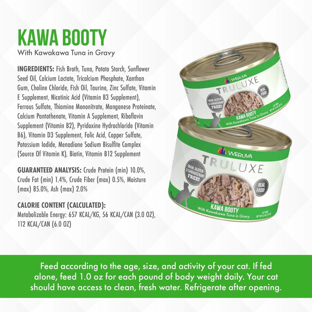 Fuel your little carnivore’s adventures with the Weruva Truluxe Kawa Booty with Kawakawa Tuna in Gravy Grain-Free Canned Cat Food. Made with wild-caught Kawakawa tuna—a premium fish from tropical waters—as the first ingredient, every juicy bite is loaded with the meat your pal craves, and all the protein he needs for healthy muscles. Since it’s formulated with a perfectly-balanced blend of vitamins, minerals and heart-healthy taurine, every easy-open can is actually a complete meal—on its own or as a tasty kibble topper. Your kitty will love the meaty morsels and luscious gravy that also provides plenty of hydration so he can stay healthy, from nose to tail. It’s no wonder that for cats everywhere, Weruva is also known as “the best cat food under the sun!”