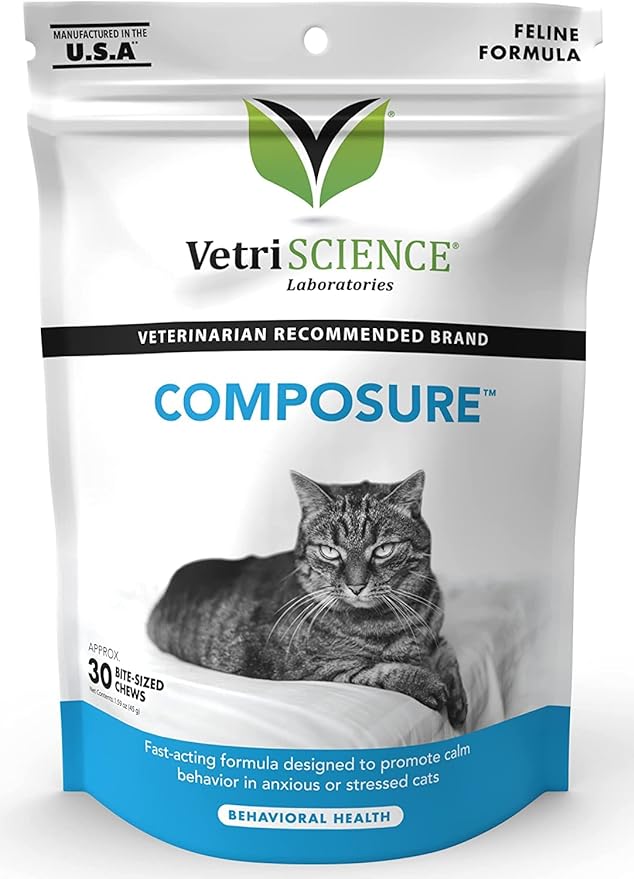 Composure Feline chews are for cats exhibiting nervousness, hyperactivity, anxiety or responding to environmentally-induced stress. It is an advanced formula that contains a combination of factors not found in other calming formulas, which supports balanced behavior.
