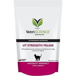 VetriScience UT Strength Feline Bite-sized Chews are a comprehensive formula designed to support urinary tract health - specifically formulated for long-term use for cats predisposed to infections and crystals. Each chicken-liver flavored chew contains beneficial direct-fed microbials (probiotics), N-Acetyl-Glucosamine, cranberry extract, and more.
