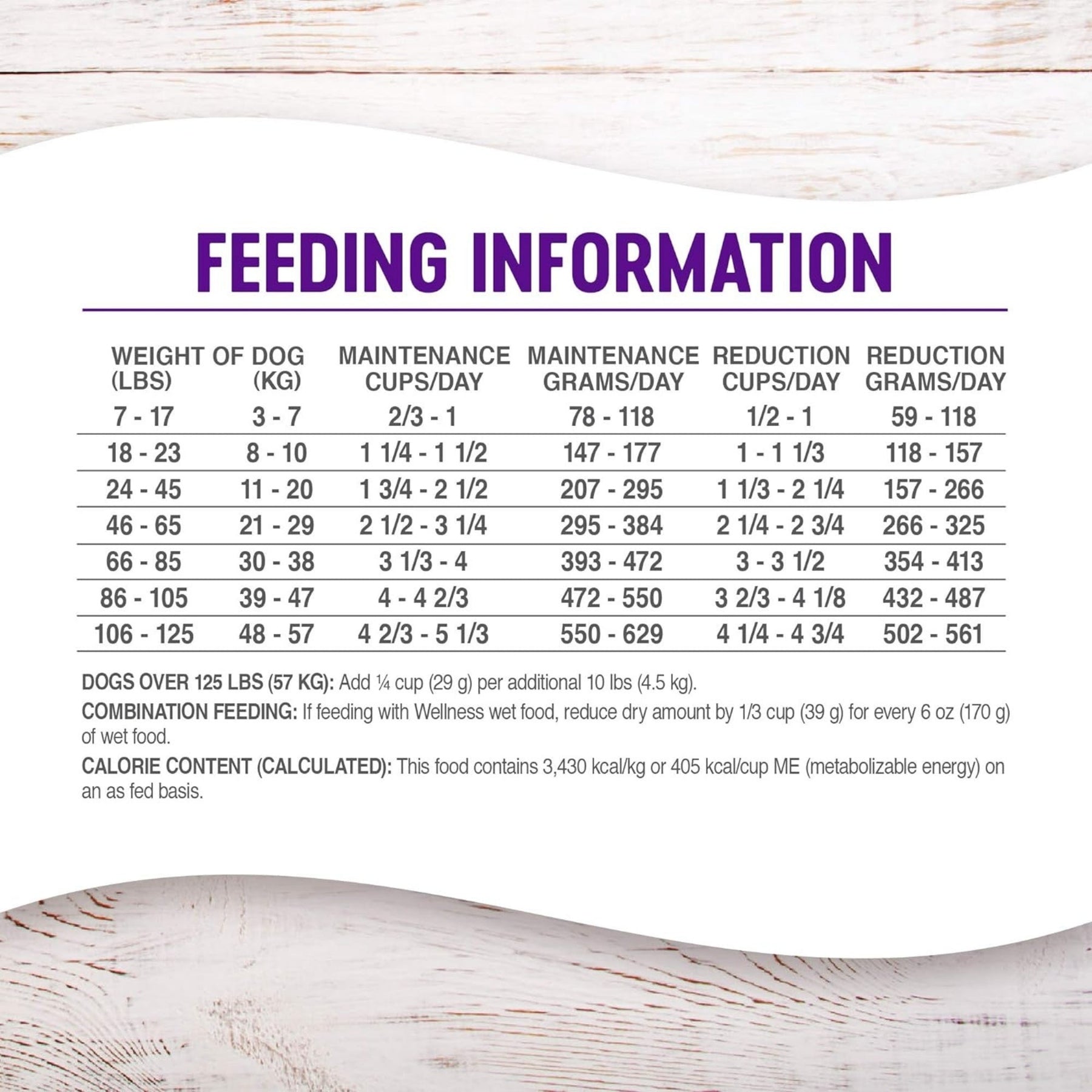 Wellness Complete Health Natural Dry Dog Food, Healthy Weight Recipe, is healthy, natural dog food for adult dogs made with carefully chosen, authentic ingredients and with reduced calories for your less active or overweight dog and provides whole-body nutritional support for healthy weight loss and weight maintenance. Wellness Complete Health Dry Dog Food supports your dog's healthy weight loss, balanced natural nutrition, optimal nutrient absorption and hip and joint health, all with natural and delicious ingredients to provide a guaranteed great taste that dogs love.