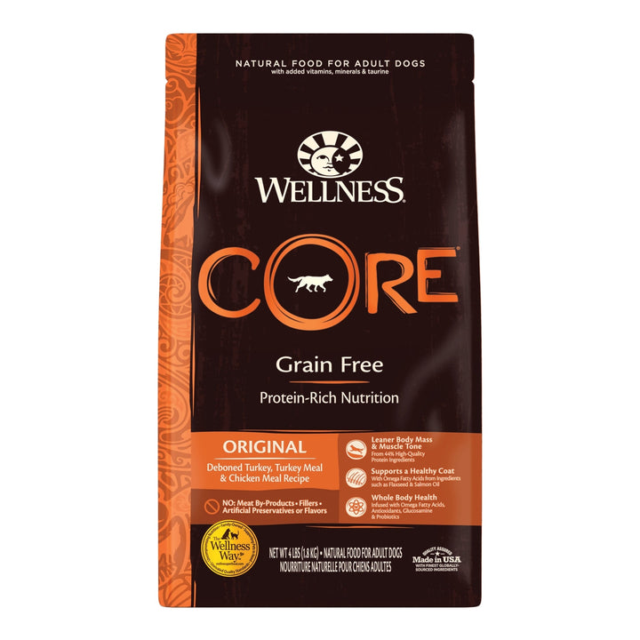 Wellness CORE Natural Grain Free Dry Dog Food Original Turkey & Chicken Recipe is healthy, 100% natural grain free dog food for adult dogs made with turkey, chicken, salmon oil and fruits and vegetables to help support your dog's optimal health and fortified with antioxidents, probiotics, vitamins and minerals, including fish and flax omega blend for healthy skin and coat. Wellness CORE grain free dog food formulas are based on the nutritional philosophy that dogs thrive on a diet mainly comprised of meat. Each grain free, nutrient-rich formula provides high quality protein for your dog with no meat by-products or fillers, grain, corn, soy, wheat-gluten or artificial preservatives, colors or flavors.
