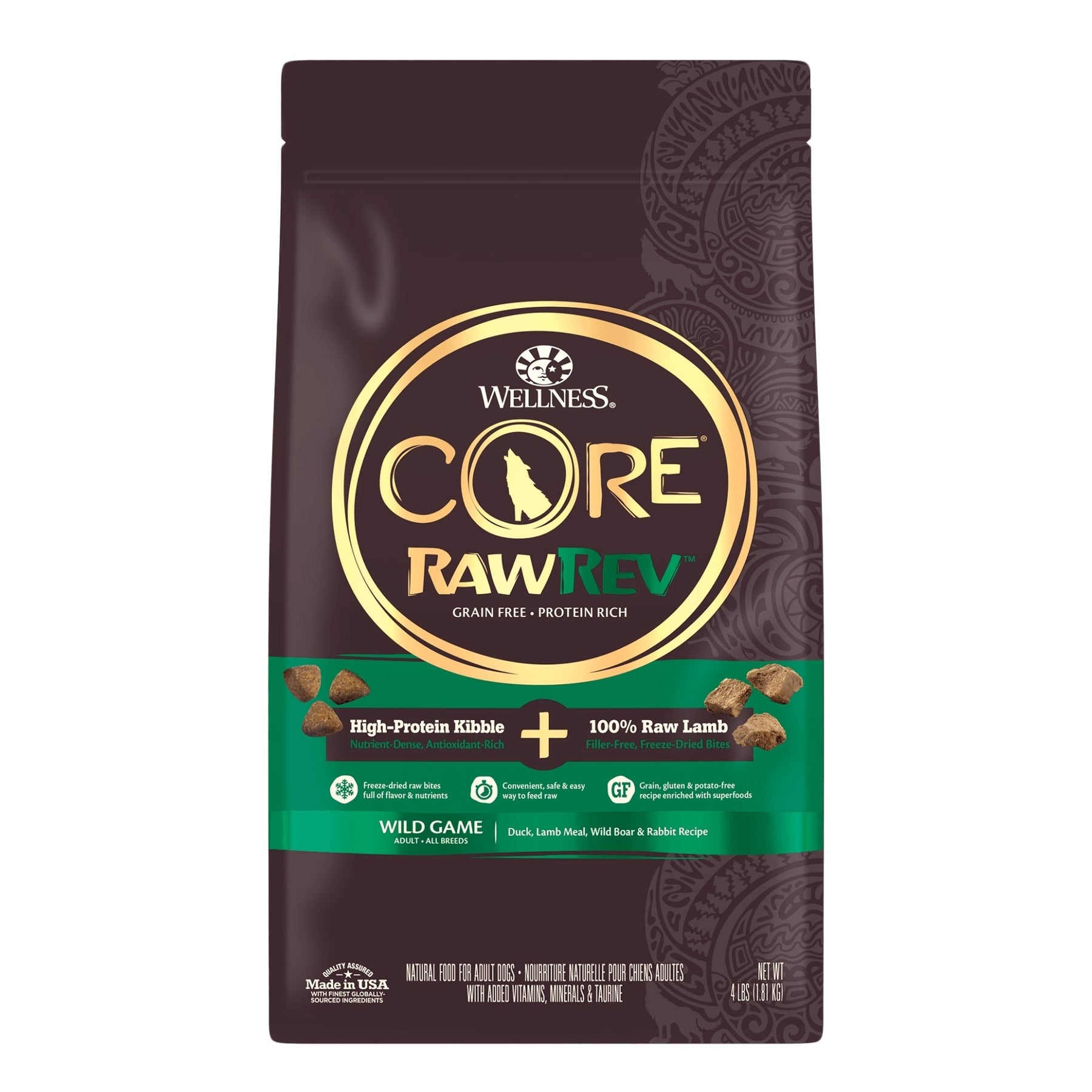 Raw protein is what your dog craves instinctively. CORE RawRev allows you to add raw easily and safely to every meal. These raw pieces are incredibly tasty and provide a boost of protein, enzymes and minerals in their most natural state. This dog food features crunchy kibble and freeze-dried bits of protein. It is fortified with omega fatty acids, antioxidants, glucosamine, probiotics and taurine. With more of the protein your dog craves and no fillers, it’s easy to provide the nutrition your dog needs to thrive from the core.